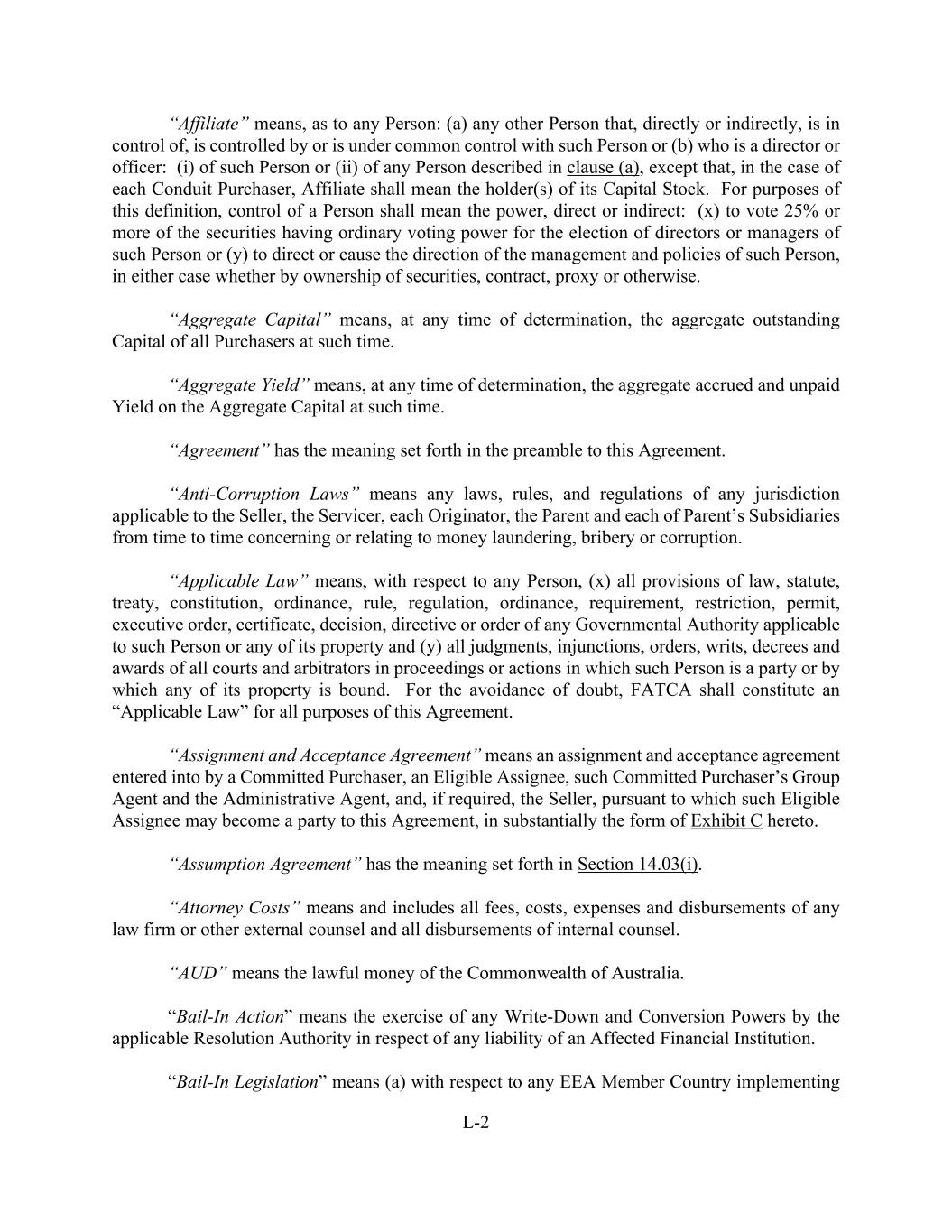 L-2 “Affiliate” means, as to any Person: (a) any other Person that, directly or indirectly, is in control of, is controlled by or is under common control with such Person or (b) who is a director or officer: (i) of such Person or (ii) of any Person described in clause (a), except that, in the case of each Conduit Purchaser, Affiliate shall mean the holder(s) of its Capital Stock. For purposes of this definition, control of a Person shall mean the power, direct or indirect: (x) to vote 25% or more of the securities having ordinary voting power for the election of directors or managers of such Person or (y) to direct or cause the direction of the management and policies of such Person, in either case whether by ownership of securities, contract, proxy or otherwise. “Aggregate Capital” means, at any time of determination, the aggregate outstanding Capital of all Purchasers at such time. “Aggregate Yield” means, at any time of determination, the aggregate accrued and unpaid Yield on the Aggregate Capital at such time. “Agreement” has the meaning set forth in the preamble to this Agreement. “Anti-Corruption Laws” means any laws, rules, and regulations of any jurisdiction applicable to the Seller, the Servicer, each Originator, the Parent and each of Parent’s Subsidiaries from time to time concerning or relating to money laundering, bribery or corruption. “Applicable Law” means, with respect to any Person, (x) all provisions of law, statute, treaty, constitution, ordinance, rule, regulation, ordinance, requirement, restriction, permit, executive order, certificate, decision, directive or order of any Governmental Authority applicable to such Person or any of its property and (y) all judgments, injunctions, orders, writs, decrees and awards of all courts and arbitrators in proceedings or actions in which such Person is a party or by which any of its property is bound. For the avoidance of doubt, FATCA shall constitute an “Applicable Law” for all purposes of this Agreement. “Assignment and Acceptance Agreement” means an assignment and acceptance agreement entered into by a Committed Purchaser, an Eligible Assignee, such Committed Purchaser’s Group Agent and the Administrative Agent, and, if required, the Seller, pursuant to which such Eligible Assignee may become a party to this Agreement, in substantially the form of Exhibit C hereto. “Assumption Agreement” has the meaning set forth in Section 14.03(i). “Attorney Costs” means and includes all fees, costs, expenses and disbursements of any law firm or other external counsel and all disbursements of internal counsel. “AUD” means the lawful money of the Commonwealth of Australia. “Bail-In Action” means the exercise of any Write-Down and Conversion Powers by the applicable Resolution Authority in respect of any liability of an Affected Financial Institution. “Bail-In Legislation” means (a) with respect to any EEA Member Country implementing