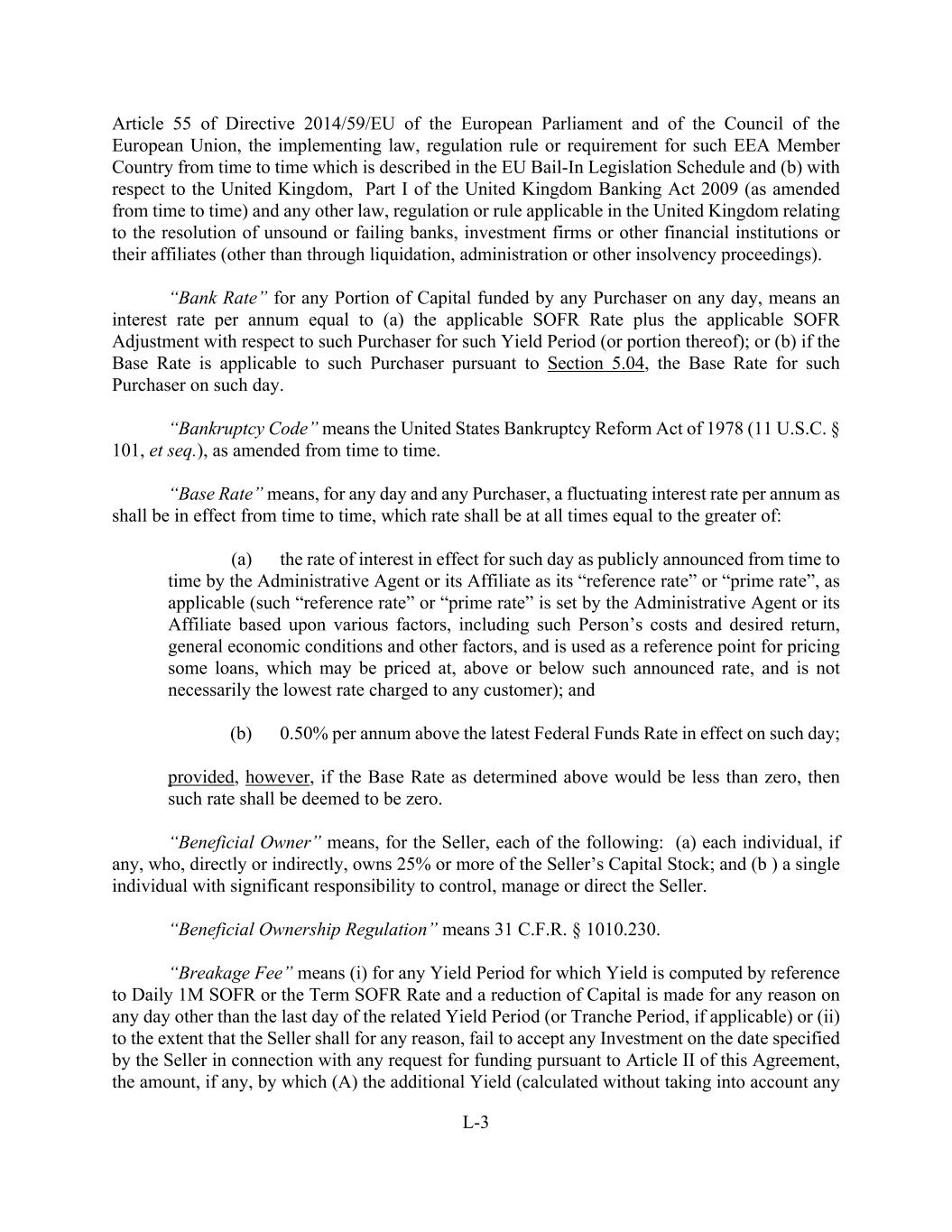 L-3 Article 55 of Directive 2014/59/EU of the European Parliament and of the Council of the European Union, the implementing law, regulation rule or requirement for such EEA Member Country from time to time which is described in the EU Bail-In Legislation Schedule and (b) with respect to the United Kingdom, Part I of the United Kingdom Banking Act 2009 (as amended from time to time) and any other law, regulation or rule applicable in the United Kingdom relating to the resolution of unsound or failing banks, investment firms or other financial institutions or their affiliates (other than through liquidation, administration or other insolvency proceedings). “Bank Rate” for any Portion of Capital funded by any Purchaser on any day, means an interest rate per annum equal to (a) the applicable SOFR Rate plus the applicable SOFR Adjustment with respect to such Purchaser for such Yield Period (or portion thereof); or (b) if the Base Rate is applicable to such Purchaser pursuant to Section 5.04, the Base Rate for such Purchaser on such day. “Bankruptcy Code” means the United States Bankruptcy Reform Act of 1978 (11 U.S.C. § 101, et seq.), as amended from time to time. “Base Rate” means, for any day and any Purchaser, a fluctuating interest rate per annum as shall be in effect from time to time, which rate shall be at all times equal to the greater of: (a) the rate of interest in effect for such day as publicly announced from time to time by the Administrative Agent or its Affiliate as its “reference rate” or “prime rate”, as applicable (such “reference rate” or “prime rate” is set by the Administrative Agent or its Affiliate based upon various factors, including such Person’s costs and desired return, general economic conditions and other factors, and is used as a reference point for pricing some loans, which may be priced at, above or below such announced rate, and is not necessarily the lowest rate charged to any customer); and (b) 0.50% per annum above the latest Federal Funds Rate in effect on such day; provided, however, if the Base Rate as determined above would be less than zero, then such rate shall be deemed to be zero. “Beneficial Owner” means, for the Seller, each of the following: (a) each individual, if any, who, directly or indirectly, owns 25% or more of the Seller’s Capital Stock; and (b ) a single individual with significant responsibility to control, manage or direct the Seller. “Beneficial Ownership Regulation” means 31 C.F.R. § 1010.230. “Breakage Fee” means (i) for any Yield Period for which Yield is computed by reference to Daily 1M SOFR or the Term SOFR Rate and a reduction of Capital is made for any reason on any day other than the last day of the related Yield Period (or Tranche Period, if applicable) or (ii) to the extent that the Seller shall for any reason, fail to accept any Investment on the date specified by the Seller in connection with any request for funding pursuant to Article II of this Agreement, the amount, if any, by which (A) the additional Yield (calculated without taking into account any