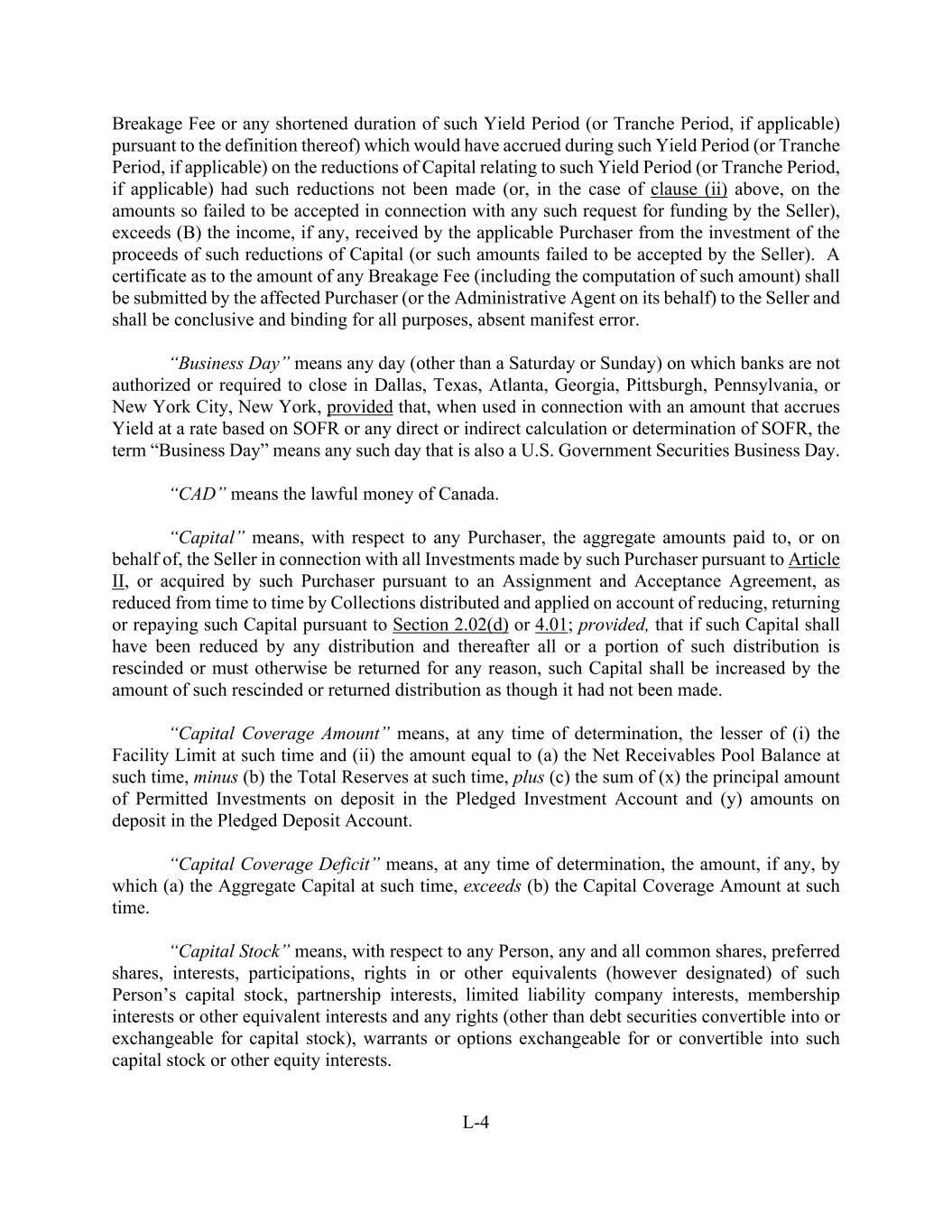 L-4 Breakage Fee or any shortened duration of such Yield Period (or Tranche Period, if applicable) pursuant to the definition thereof) which would have accrued during such Yield Period (or Tranche Period, if applicable) on the reductions of Capital relating to such Yield Period (or Tranche Period, if applicable) had such reductions not been made (or, in the case of clause (ii) above, on the amounts so failed to be accepted in connection with any such request for funding by the Seller), exceeds (B) the income, if any, received by the applicable Purchaser from the investment of the proceeds of such reductions of Capital (or such amounts failed to be accepted by the Seller). A certificate as to the amount of any Breakage Fee (including the computation of such amount) shall be submitted by the affected Purchaser (or the Administrative Agent on its behalf) to the Seller and shall be conclusive and binding for all purposes, absent manifest error. “Business Day” means any day (other than a Saturday or Sunday) on which banks are not authorized or required to close in Dallas, Texas, Atlanta, Georgia, Pittsburgh, Pennsylvania, or New York City, New York, provided that, when used in connection with an amount that accrues Yield at a rate based on SOFR or any direct or indirect calculation or determination of SOFR, the term “Business Day” means any such day that is also a U.S. Government Securities Business Day. “CAD” means the lawful money of Canada. “Capital” means, with respect to any Purchaser, the aggregate amounts paid to, or on behalf of, the Seller in connection with all Investments made by such Purchaser pursuant to Article II, or acquired by such Purchaser pursuant to an Assignment and Acceptance Agreement, as reduced from time to time by Collections distributed and applied on account of reducing, returning or repaying such Capital pursuant to Section 2.02(d) or 4.01; provided, that if such Capital shall have been reduced by any distribution and thereafter all or a portion of such distribution is rescinded or must otherwise be returned for any reason, such Capital shall be increased by the amount of such rescinded or returned distribution as though it had not been made. “Capital Coverage Amount” means, at any time of determination, the lesser of (i) the Facility Limit at such time and (ii) the amount equal to (a) the Net Receivables Pool Balance at such time, minus (b) the Total Reserves at such time, plus (c) the sum of (x) the principal amount of Permitted Investments on deposit in the Pledged Investment Account and (y) amounts on deposit in the Pledged Deposit Account. “Capital Coverage Deficit” means, at any time of determination, the amount, if any, by which (a) the Aggregate Capital at such time, exceeds (b) the Capital Coverage Amount at such time. “Capital Stock” means, with respect to any Person, any and all common shares, preferred shares, interests, participations, rights in or other equivalents (however designated) of such Person’s capital stock, partnership interests, limited liability company interests, membership interests or other equivalent interests and any rights (other than debt securities convertible into or exchangeable for capital stock), warrants or options exchangeable for or convertible into such capital stock or other equity interests.