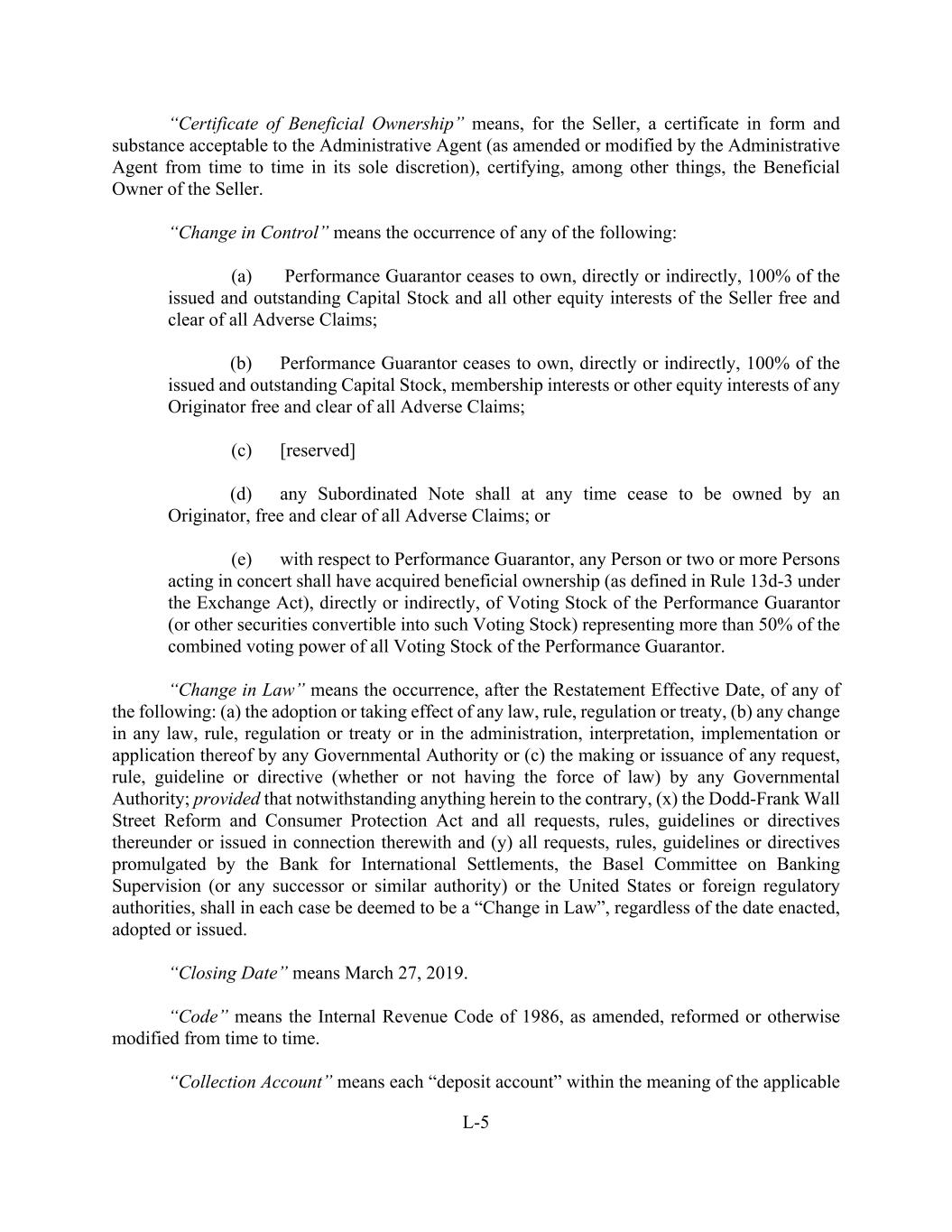 L-5 “Certificate of Beneficial Ownership” means, for the Seller, a certificate in form and substance acceptable to the Administrative Agent (as amended or modified by the Administrative Agent from time to time in its sole discretion), certifying, among other things, the Beneficial Owner of the Seller. “Change in Control” means the occurrence of any of the following: (a) Performance Guarantor ceases to own, directly or indirectly, 100% of the issued and outstanding Capital Stock and all other equity interests of the Seller free and clear of all Adverse Claims; (b) Performance Guarantor ceases to own, directly or indirectly, 100% of the issued and outstanding Capital Stock, membership interests or other equity interests of any Originator free and clear of all Adverse Claims; (c) [reserved] (d) any Subordinated Note shall at any time cease to be owned by an Originator, free and clear of all Adverse Claims; or (e) with respect to Performance Guarantor, any Person or two or more Persons acting in concert shall have acquired beneficial ownership (as defined in Rule 13d-3 under the Exchange Act), directly or indirectly, of Voting Stock of the Performance Guarantor (or other securities convertible into such Voting Stock) representing more than 50% of the combined voting power of all Voting Stock of the Performance Guarantor. “Change in Law” means the occurrence, after the Restatement Effective Date, of any of the following: (a) the adoption or taking effect of any law, rule, regulation or treaty, (b) any change in any law, rule, regulation or treaty or in the administration, interpretation, implementation or application thereof by any Governmental Authority or (c) the making or issuance of any request, rule, guideline or directive (whether or not having the force of law) by any Governmental Authority; provided that notwithstanding anything herein to the contrary, (x) the Dodd-Frank Wall Street Reform and Consumer Protection Act and all requests, rules, guidelines or directives thereunder or issued in connection therewith and (y) all requests, rules, guidelines or directives promulgated by the Bank for International Settlements, the Basel Committee on Banking Supervision (or any successor or similar authority) or the United States or foreign regulatory authorities, shall in each case be deemed to be a “Change in Law”, regardless of the date enacted, adopted or issued. “Closing Date” means March 27, 2019. “Code” means the Internal Revenue Code of 1986, as amended, reformed or otherwise modified from time to time. “Collection Account” means each “deposit account” within the meaning of the applicable