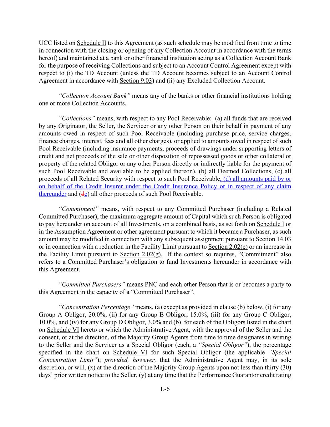 L-6 UCC listed on Schedule II to this Agreement (as such schedule may be modified from time to time in connection with the closing or opening of any Collection Account in accordance with the terms hereof) and maintained at a bank or other financial institution acting as a Collection Account Bank for the purpose of receiving Collections and subject to an Account Control Agreement except with respect to (i) the TD Account (unless the TD Account becomes subject to an Account Control Agreement in accordance with Section 9.03) and (ii) any Excluded Collection Account. “Collection Account Bank” means any of the banks or other financial institutions holding one or more Collection Accounts. “Collections” means, with respect to any Pool Receivable: (a) all funds that are received by any Originator, the Seller, the Servicer or any other Person on their behalf in payment of any amounts owed in respect of such Pool Receivable (including purchase price, service charges, finance charges, interest, fees and all other charges), or applied to amounts owed in respect of such Pool Receivable (including insurance payments, proceeds of drawings under supporting letters of credit and net proceeds of the sale or other disposition of repossessed goods or other collateral or property of the related Obligor or any other Person directly or indirectly liable for the payment of such Pool Receivable and available to be applied thereon), (b) all Deemed Collections, (c) all proceeds of all Related Security with respect to such Pool Receivable, (d) all amounts paid by or on behalf of the Credit Insurer under the Credit Insurance Policy or in respect of any claim thereunder and (de) all other proceeds of such Pool Receivable. “Commitment” means, with respect to any Committed Purchaser (including a Related Committed Purchaser), the maximum aggregate amount of Capital which such Person is obligated to pay hereunder on account of all Investments, on a combined basis, as set forth on Schedule I or in the Assumption Agreement or other agreement pursuant to which it became a Purchaser, as such amount may be modified in connection with any subsequent assignment pursuant to Section 14.03 or in connection with a reduction in the Facility Limit pursuant to Section 2.02(e) or an increase in the Facility Limit pursuant to Section 2.02(g). If the context so requires, “Commitment” also refers to a Committed Purchaser’s obligation to fund Investments hereunder in accordance with this Agreement. “Committed Purchasers” means PNC and each other Person that is or becomes a party to this Agreement in the capacity of a “Committed Purchaser”. “Concentration Percentage” means, (a) except as provided in clause (b) below, (i) for any Group A Obligor, 20.0%, (ii) for any Group B Obligor, 15.0%, (iii) for any Group C Obligor, 10.0%, and (iv) for any Group D Obligor, 3.0% and (b) for each of the Obligors listed in the chart on Schedule VI hereto or which the Administrative Agent, with the approval of the Seller and the consent, or at the direction, of the Majority Group Agents from time to time designates in writing to the Seller and the Servicer as a Special Obligor (each, a “Special Obligor”), the percentage specified in the chart on Schedule VI for such Special Obligor (the applicable “Special Concentration Limit”); provided, however, that the Administrative Agent may, in its sole discretion, or will, (x) at the direction of the Majority Group Agents upon not less than thirty (30) days’ prior written notice to the Seller, (y) at any time that the Performance Guarantor credit rating