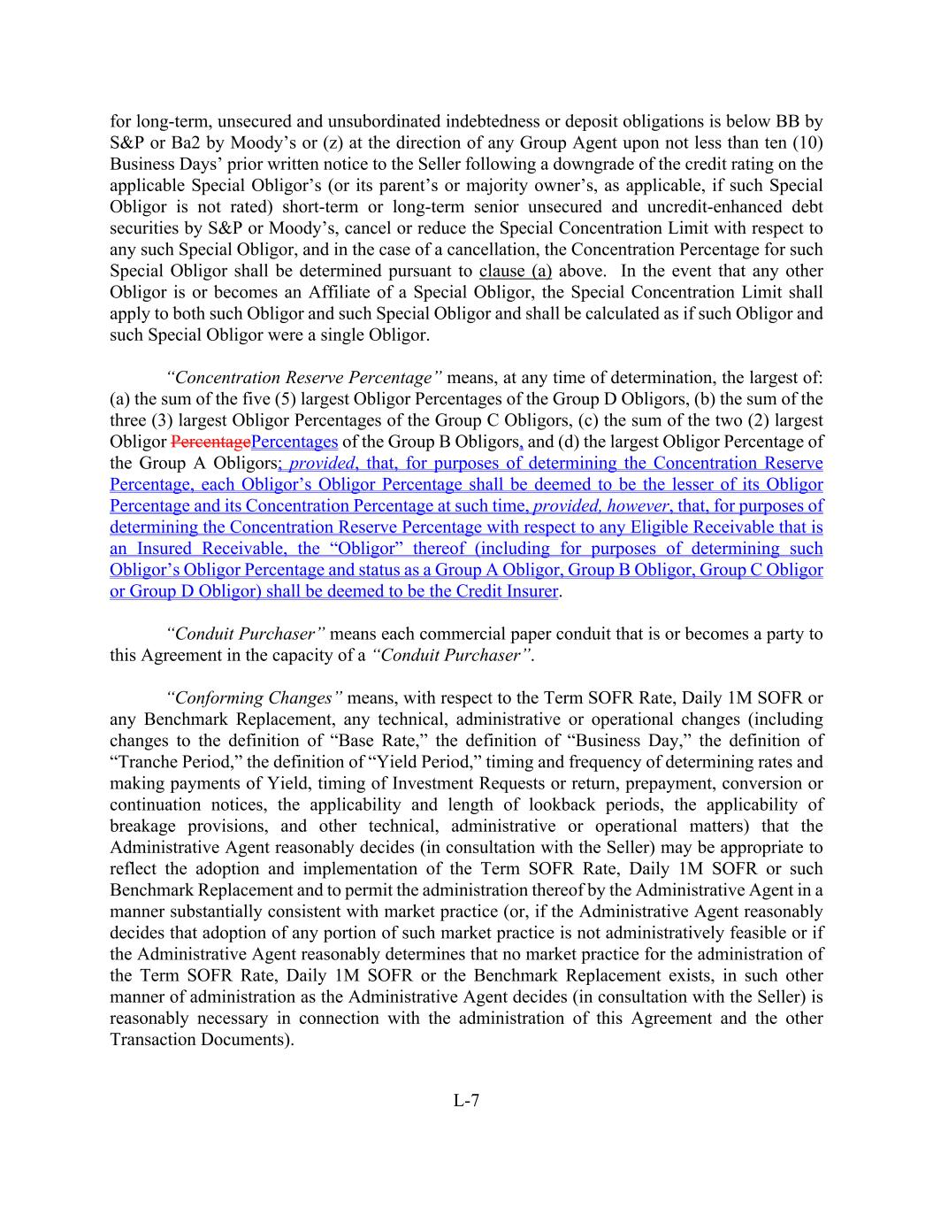 L-7 for long-term, unsecured and unsubordinated indebtedness or deposit obligations is below BB by S&P or Ba2 by Moody’s or (z) at the direction of any Group Agent upon not less than ten (10) Business Days’ prior written notice to the Seller following a downgrade of the credit rating on the applicable Special Obligor’s (or its parent’s or majority owner’s, as applicable, if such Special Obligor is not rated) short-term or long-term senior unsecured and uncredit-enhanced debt securities by S&P or Moody’s, cancel or reduce the Special Concentration Limit with respect to any such Special Obligor, and in the case of a cancellation, the Concentration Percentage for such Special Obligor shall be determined pursuant to clause (a) above. In the event that any other Obligor is or becomes an Affiliate of a Special Obligor, the Special Concentration Limit shall apply to both such Obligor and such Special Obligor and shall be calculated as if such Obligor and such Special Obligor were a single Obligor. “Concentration Reserve Percentage” means, at any time of determination, the largest of: (a) the sum of the five (5) largest Obligor Percentages of the Group D Obligors, (b) the sum of the three (3) largest Obligor Percentages of the Group C Obligors, (c) the sum of the two (2) largest Obligor PercentagePercentages of the Group B Obligors, and (d) the largest Obligor Percentage of the Group A Obligors; provided, that, for purposes of determining the Concentration Reserve Percentage, each Obligor’s Obligor Percentage shall be deemed to be the lesser of its Obligor Percentage and its Concentration Percentage at such time, provided, however, that, for purposes of determining the Concentration Reserve Percentage with respect to any Eligible Receivable that is an Insured Receivable, the “Obligor” thereof (including for purposes of determining such Obligor’s Obligor Percentage and status as a Group A Obligor, Group B Obligor, Group C Obligor or Group D Obligor) shall be deemed to be the Credit Insurer. “Conduit Purchaser” means each commercial paper conduit that is or becomes a party to this Agreement in the capacity of a “Conduit Purchaser”. “Conforming Changes” means, with respect to the Term SOFR Rate, Daily 1M SOFR or any Benchmark Replacement, any technical, administrative or operational changes (including changes to the definition of “Base Rate,” the definition of “Business Day,” the definition of “Tranche Period,” the definition of “Yield Period,” timing and frequency of determining rates and making payments of Yield, timing of Investment Requests or return, prepayment, conversion or continuation notices, the applicability and length of lookback periods, the applicability of breakage provisions, and other technical, administrative or operational matters) that the Administrative Agent reasonably decides (in consultation with the Seller) may be appropriate to reflect the adoption and implementation of the Term SOFR Rate, Daily 1M SOFR or such Benchmark Replacement and to permit the administration thereof by the Administrative Agent in a manner substantially consistent with market practice (or, if the Administrative Agent reasonably decides that adoption of any portion of such market practice is not administratively feasible or if the Administrative Agent reasonably determines that no market practice for the administration of the Term SOFR Rate, Daily 1M SOFR or the Benchmark Replacement exists, in such other manner of administration as the Administrative Agent decides (in consultation with the Seller) is reasonably necessary in connection with the administration of this Agreement and the other Transaction Documents).