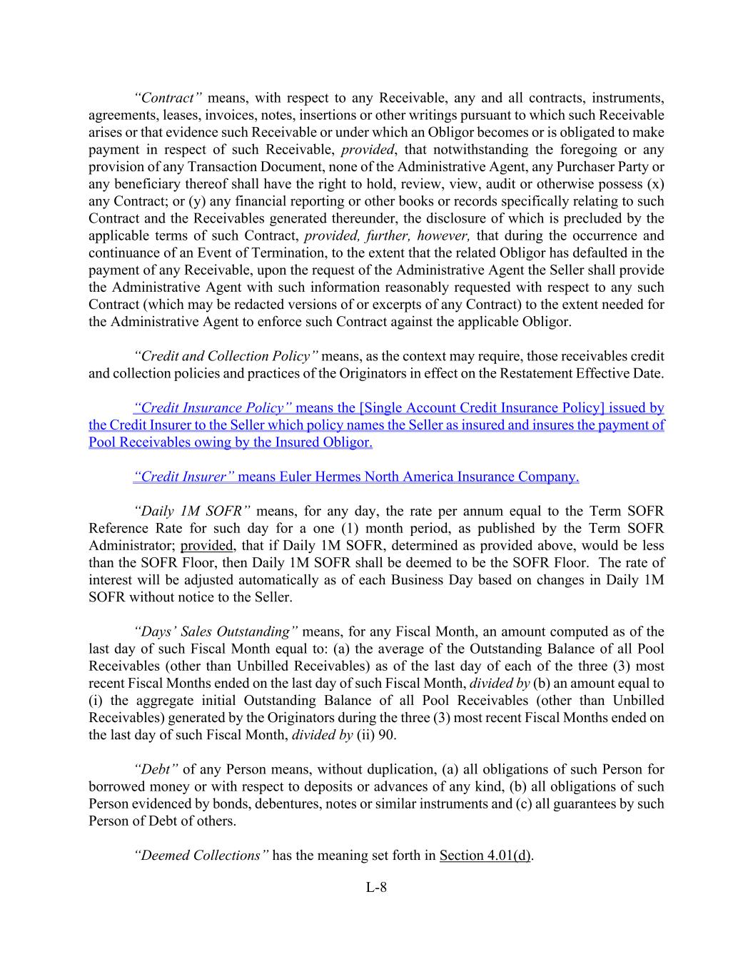 L-8 “Contract” means, with respect to any Receivable, any and all contracts, instruments, agreements, leases, invoices, notes, insertions or other writings pursuant to which such Receivable arises or that evidence such Receivable or under which an Obligor becomes or is obligated to make payment in respect of such Receivable, provided, that notwithstanding the foregoing or any provision of any Transaction Document, none of the Administrative Agent, any Purchaser Party or any beneficiary thereof shall have the right to hold, review, view, audit or otherwise possess (x) any Contract; or (y) any financial reporting or other books or records specifically relating to such Contract and the Receivables generated thereunder, the disclosure of which is precluded by the applicable terms of such Contract, provided, further, however, that during the occurrence and continuance of an Event of Termination, to the extent that the related Obligor has defaulted in the payment of any Receivable, upon the request of the Administrative Agent the Seller shall provide the Administrative Agent with such information reasonably requested with respect to any such Contract (which may be redacted versions of or excerpts of any Contract) to the extent needed for the Administrative Agent to enforce such Contract against the applicable Obligor. “Credit and Collection Policy” means, as the context may require, those receivables credit and collection policies and practices of the Originators in effect on the Restatement Effective Date. “Credit Insurance Policy” means the [Single Account Credit Insurance Policy] issued by the Credit Insurer to the Seller which policy names the Seller as insured and insures the payment of Pool Receivables owing by the Insured Obligor. “Credit Insurer” means Euler Hermes North America Insurance Company. “Daily 1M SOFR” means, for any day, the rate per annum equal to the Term SOFR Reference Rate for such day for a one (1) month period, as published by the Term SOFR Administrator; provided, that if Daily 1M SOFR, determined as provided above, would be less than the SOFR Floor, then Daily 1M SOFR shall be deemed to be the SOFR Floor. The rate of interest will be adjusted automatically as of each Business Day based on changes in Daily 1M SOFR without notice to the Seller. “Days’ Sales Outstanding” means, for any Fiscal Month, an amount computed as of the last day of such Fiscal Month equal to: (a) the average of the Outstanding Balance of all Pool Receivables (other than Unbilled Receivables) as of the last day of each of the three (3) most recent Fiscal Months ended on the last day of such Fiscal Month, divided by (b) an amount equal to (i) the aggregate initial Outstanding Balance of all Pool Receivables (other than Unbilled Receivables) generated by the Originators during the three (3) most recent Fiscal Months ended on the last day of such Fiscal Month, divided by (ii) 90. “Debt” of any Person means, without duplication, (a) all obligations of such Person for borrowed money or with respect to deposits or advances of any kind, (b) all obligations of such Person evidenced by bonds, debentures, notes or similar instruments and (c) all guarantees by such Person of Debt of others. “Deemed Collections” has the meaning set forth in Section 4.01(d).