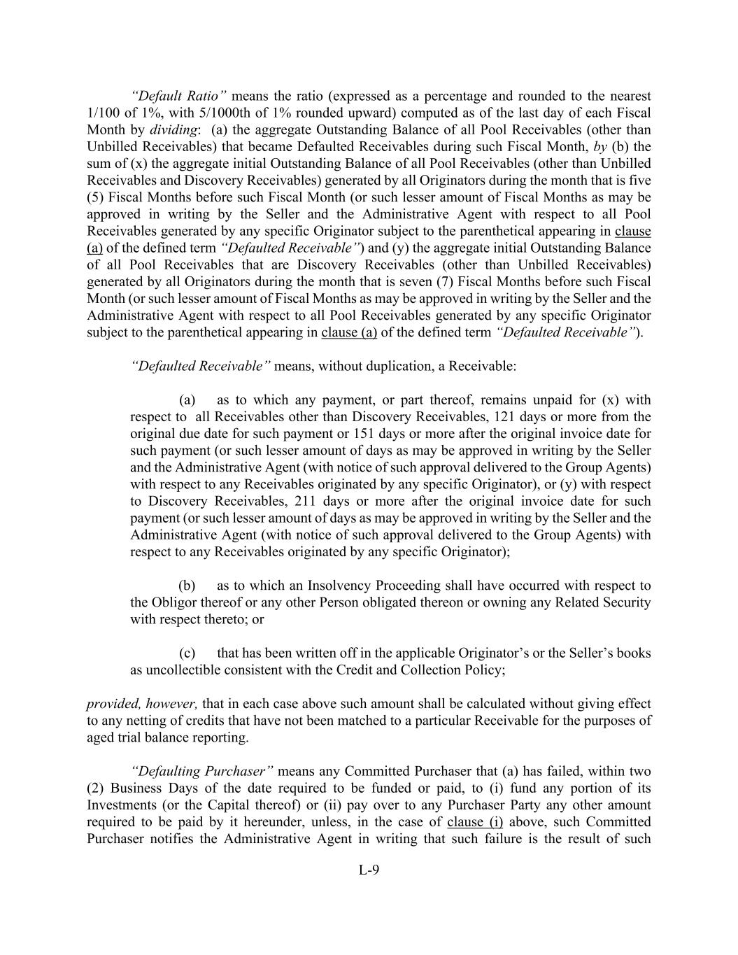 L-9 “Default Ratio” means the ratio (expressed as a percentage and rounded to the nearest 1/100 of 1%, with 5/1000th of 1% rounded upward) computed as of the last day of each Fiscal Month by dividing: (a) the aggregate Outstanding Balance of all Pool Receivables (other than Unbilled Receivables) that became Defaulted Receivables during such Fiscal Month, by (b) the sum of (x) the aggregate initial Outstanding Balance of all Pool Receivables (other than Unbilled Receivables and Discovery Receivables) generated by all Originators during the month that is five (5) Fiscal Months before such Fiscal Month (or such lesser amount of Fiscal Months as may be approved in writing by the Seller and the Administrative Agent with respect to all Pool Receivables generated by any specific Originator subject to the parenthetical appearing in clause (a) of the defined term “Defaulted Receivable”) and (y) the aggregate initial Outstanding Balance of all Pool Receivables that are Discovery Receivables (other than Unbilled Receivables) generated by all Originators during the month that is seven (7) Fiscal Months before such Fiscal Month (or such lesser amount of Fiscal Months as may be approved in writing by the Seller and the Administrative Agent with respect to all Pool Receivables generated by any specific Originator subject to the parenthetical appearing in clause (a) of the defined term “Defaulted Receivable”). “Defaulted Receivable” means, without duplication, a Receivable: (a) as to which any payment, or part thereof, remains unpaid for (x) with respect to all Receivables other than Discovery Receivables, 121 days or more from the original due date for such payment or 151 days or more after the original invoice date for such payment (or such lesser amount of days as may be approved in writing by the Seller and the Administrative Agent (with notice of such approval delivered to the Group Agents) with respect to any Receivables originated by any specific Originator), or (y) with respect to Discovery Receivables, 211 days or more after the original invoice date for such payment (or such lesser amount of days as may be approved in writing by the Seller and the Administrative Agent (with notice of such approval delivered to the Group Agents) with respect to any Receivables originated by any specific Originator); (b) as to which an Insolvency Proceeding shall have occurred with respect to the Obligor thereof or any other Person obligated thereon or owning any Related Security with respect thereto; or (c) that has been written off in the applicable Originator’s or the Seller’s books as uncollectible consistent with the Credit and Collection Policy; provided, however, that in each case above such amount shall be calculated without giving effect to any netting of credits that have not been matched to a particular Receivable for the purposes of aged trial balance reporting. “Defaulting Purchaser” means any Committed Purchaser that (a) has failed, within two (2) Business Days of the date required to be funded or paid, to (i) fund any portion of its Investments (or the Capital thereof) or (ii) pay over to any Purchaser Party any other amount required to be paid by it hereunder, unless, in the case of clause (i) above, such Committed Purchaser notifies the Administrative Agent in writing that such failure is the result of such