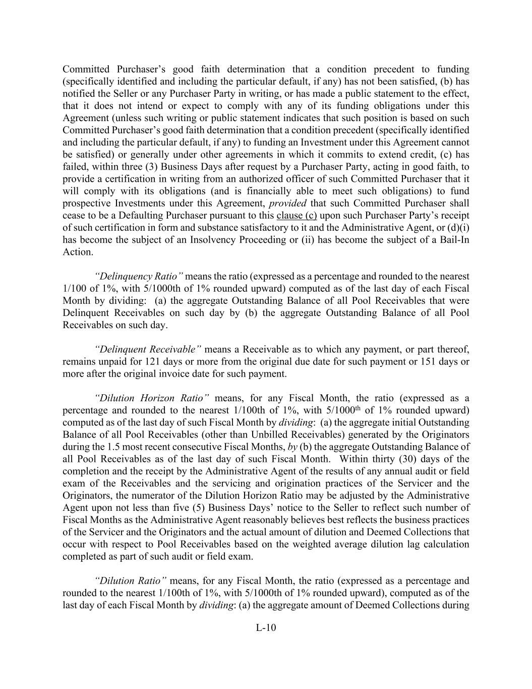 L-10 Committed Purchaser’s good faith determination that a condition precedent to funding (specifically identified and including the particular default, if any) has not been satisfied, (b) has notified the Seller or any Purchaser Party in writing, or has made a public statement to the effect, that it does not intend or expect to comply with any of its funding obligations under this Agreement (unless such writing or public statement indicates that such position is based on such Committed Purchaser’s good faith determination that a condition precedent (specifically identified and including the particular default, if any) to funding an Investment under this Agreement cannot be satisfied) or generally under other agreements in which it commits to extend credit, (c) has failed, within three (3) Business Days after request by a Purchaser Party, acting in good faith, to provide a certification in writing from an authorized officer of such Committed Purchaser that it will comply with its obligations (and is financially able to meet such obligations) to fund prospective Investments under this Agreement, provided that such Committed Purchaser shall cease to be a Defaulting Purchaser pursuant to this clause (c) upon such Purchaser Party’s receipt of such certification in form and substance satisfactory to it and the Administrative Agent, or (d)(i) has become the subject of an Insolvency Proceeding or (ii) has become the subject of a Bail-In Action. “Delinquency Ratio” means the ratio (expressed as a percentage and rounded to the nearest 1/100 of 1%, with 5/1000th of 1% rounded upward) computed as of the last day of each Fiscal Month by dividing: (a) the aggregate Outstanding Balance of all Pool Receivables that were Delinquent Receivables on such day by (b) the aggregate Outstanding Balance of all Pool Receivables on such day. “Delinquent Receivable” means a Receivable as to which any payment, or part thereof, remains unpaid for 121 days or more from the original due date for such payment or 151 days or more after the original invoice date for such payment. “Dilution Horizon Ratio” means, for any Fiscal Month, the ratio (expressed as a percentage and rounded to the nearest 1/100th of 1%, with 5/1000th of 1% rounded upward) computed as of the last day of such Fiscal Month by dividing: (a) the aggregate initial Outstanding Balance of all Pool Receivables (other than Unbilled Receivables) generated by the Originators during the 1.5 most recent consecutive Fiscal Months, by (b) the aggregate Outstanding Balance of all Pool Receivables as of the last day of such Fiscal Month. Within thirty (30) days of the completion and the receipt by the Administrative Agent of the results of any annual audit or field exam of the Receivables and the servicing and origination practices of the Servicer and the Originators, the numerator of the Dilution Horizon Ratio may be adjusted by the Administrative Agent upon not less than five (5) Business Days’ notice to the Seller to reflect such number of Fiscal Months as the Administrative Agent reasonably believes best reflects the business practices of the Servicer and the Originators and the actual amount of dilution and Deemed Collections that occur with respect to Pool Receivables based on the weighted average dilution lag calculation completed as part of such audit or field exam. “Dilution Ratio” means, for any Fiscal Month, the ratio (expressed as a percentage and rounded to the nearest 1/100th of 1%, with 5/1000th of 1% rounded upward), computed as of the last day of each Fiscal Month by dividing: (a) the aggregate amount of Deemed Collections during