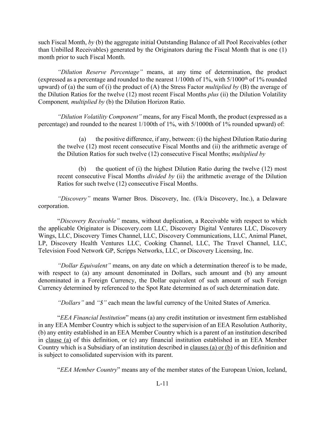 L-11 such Fiscal Month, by (b) the aggregate initial Outstanding Balance of all Pool Receivables (other than Unbilled Receivables) generated by the Originators during the Fiscal Month that is one (1) month prior to such Fiscal Month. “Dilution Reserve Percentage” means, at any time of determination, the product (expressed as a percentage and rounded to the nearest 1/100th of 1%, with 5/1000th of 1% rounded upward) of (a) the sum of (i) the product of (A) the Stress Factor multiplied by (B) the average of the Dilution Ratios for the twelve (12) most recent Fiscal Months plus (ii) the Dilution Volatility Component, multiplied by (b) the Dilution Horizon Ratio. “Dilution Volatility Component” means, for any Fiscal Month, the product (expressed as a percentage) and rounded to the nearest 1/100th of 1%, with 5/1000th of 1% rounded upward) of: (a) the positive difference, if any, between: (i) the highest Dilution Ratio during the twelve (12) most recent consecutive Fiscal Months and (ii) the arithmetic average of the Dilution Ratios for such twelve (12) consecutive Fiscal Months; multiplied by (b) the quotient of (i) the highest Dilution Ratio during the twelve (12) most recent consecutive Fiscal Months divided by (ii) the arithmetic average of the Dilution Ratios for such twelve (12) consecutive Fiscal Months. “Discovery” means Warner Bros. Discovery, Inc. (f/k/a Discovery, Inc.), a Delaware corporation. “Discovery Receivable” means, without duplication, a Receivable with respect to which the applicable Originator is Discovery.com LLC, Discovery Digital Ventures LLC, Discovery Wings, LLC, Discovery Times Channel, LLC, Discovery Communications, LLC, Animal Planet, LP, Discovery Health Ventures LLC, Cooking Channel, LLC, The Travel Channel, LLC, Television Food Network GP, Scripps Networks, LLC, or Discovery Licensing, Inc. “Dollar Equivalent” means, on any date on which a determination thereof is to be made, with respect to (a) any amount denominated in Dollars, such amount and (b) any amount denominated in a Foreign Currency, the Dollar equivalent of such amount of such Foreign Currency determined by referenced to the Spot Rate determined as of such determination date. “Dollars” and “$” each mean the lawful currency of the United States of America. “EEA Financial Institution” means (a) any credit institution or investment firm established in any EEA Member Country which is subject to the supervision of an EEA Resolution Authority, (b) any entity established in an EEA Member Country which is a parent of an institution described in clause (a) of this definition, or (c) any financial institution established in an EEA Member Country which is a Subsidiary of an institution described in clauses (a) or (b) of this definition and is subject to consolidated supervision with its parent. “EEA Member Country” means any of the member states of the European Union, Iceland,