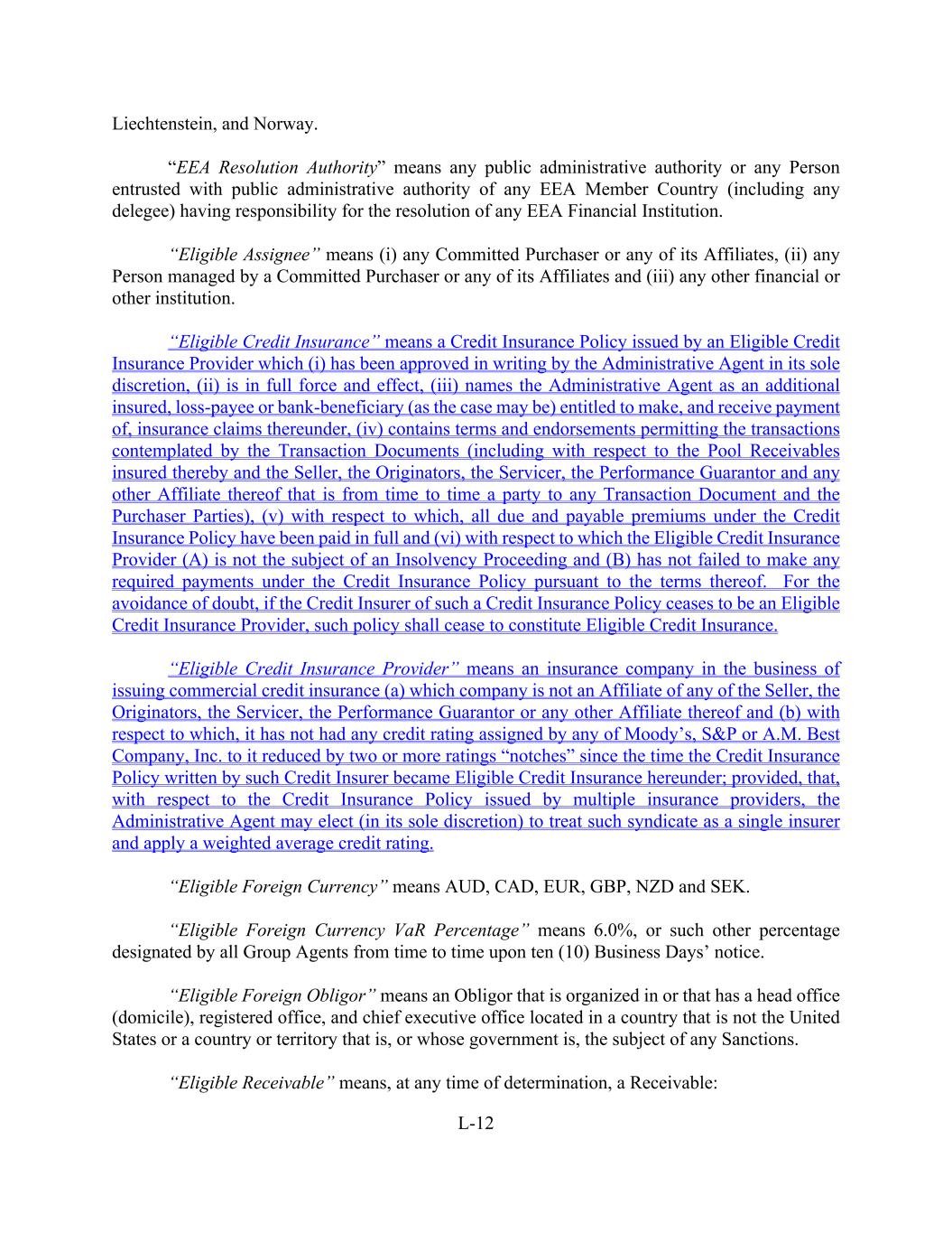 L-12 Liechtenstein, and Norway. “EEA Resolution Authority” means any public administrative authority or any Person entrusted with public administrative authority of any EEA Member Country (including any delegee) having responsibility for the resolution of any EEA Financial Institution. “Eligible Assignee” means (i) any Committed Purchaser or any of its Affiliates, (ii) any Person managed by a Committed Purchaser or any of its Affiliates and (iii) any other financial or other institution. “Eligible Credit Insurance” means a Credit Insurance Policy issued by an Eligible Credit Insurance Provider which (i) has been approved in writing by the Administrative Agent in its sole discretion, (ii) is in full force and effect, (iii) names the Administrative Agent as an additional insured, loss-payee or bank-beneficiary (as the case may be) entitled to make, and receive payment of, insurance claims thereunder, (iv) contains terms and endorsements permitting the transactions contemplated by the Transaction Documents (including with respect to the Pool Receivables insured thereby and the Seller, the Originators, the Servicer, the Performance Guarantor and any other Affiliate thereof that is from time to time a party to any Transaction Document and the Purchaser Parties), (v) with respect to which, all due and payable premiums under the Credit Insurance Policy have been paid in full and (vi) with respect to which the Eligible Credit Insurance Provider (A) is not the subject of an Insolvency Proceeding and (B) has not failed to make any required payments under the Credit Insurance Policy pursuant to the terms thereof. For the avoidance of doubt, if the Credit Insurer of such a Credit Insurance Policy ceases to be an Eligible Credit Insurance Provider, such policy shall cease to constitute Eligible Credit Insurance. “Eligible Credit Insurance Provider” means an insurance company in the business of issuing commercial credit insurance (a) which company is not an Affiliate of any of the Seller, the Originators, the Servicer, the Performance Guarantor or any other Affiliate thereof and (b) with respect to which, it has not had any credit rating assigned by any of Moody’s, S&P or A.M. Best Company, Inc. to it reduced by two or more ratings “notches” since the time the Credit Insurance Policy written by such Credit Insurer became Eligible Credit Insurance hereunder; provided, that, with respect to the Credit Insurance Policy issued by multiple insurance providers, the Administrative Agent may elect (in its sole discretion) to treat such syndicate as a single insurer and apply a weighted average credit rating. “Eligible Foreign Currency” means AUD, CAD, EUR, GBP, NZD and SEK. “Eligible Foreign Currency VaR Percentage” means 6.0%, or such other percentage designated by all Group Agents from time to time upon ten (10) Business Days’ notice. “Eligible Foreign Obligor” means an Obligor that is organized in or that has a head office (domicile), registered office, and chief executive office located in a country that is not the United States or a country or territory that is, or whose government is, the subject of any Sanctions. “Eligible Receivable” means, at any time of determination, a Receivable: