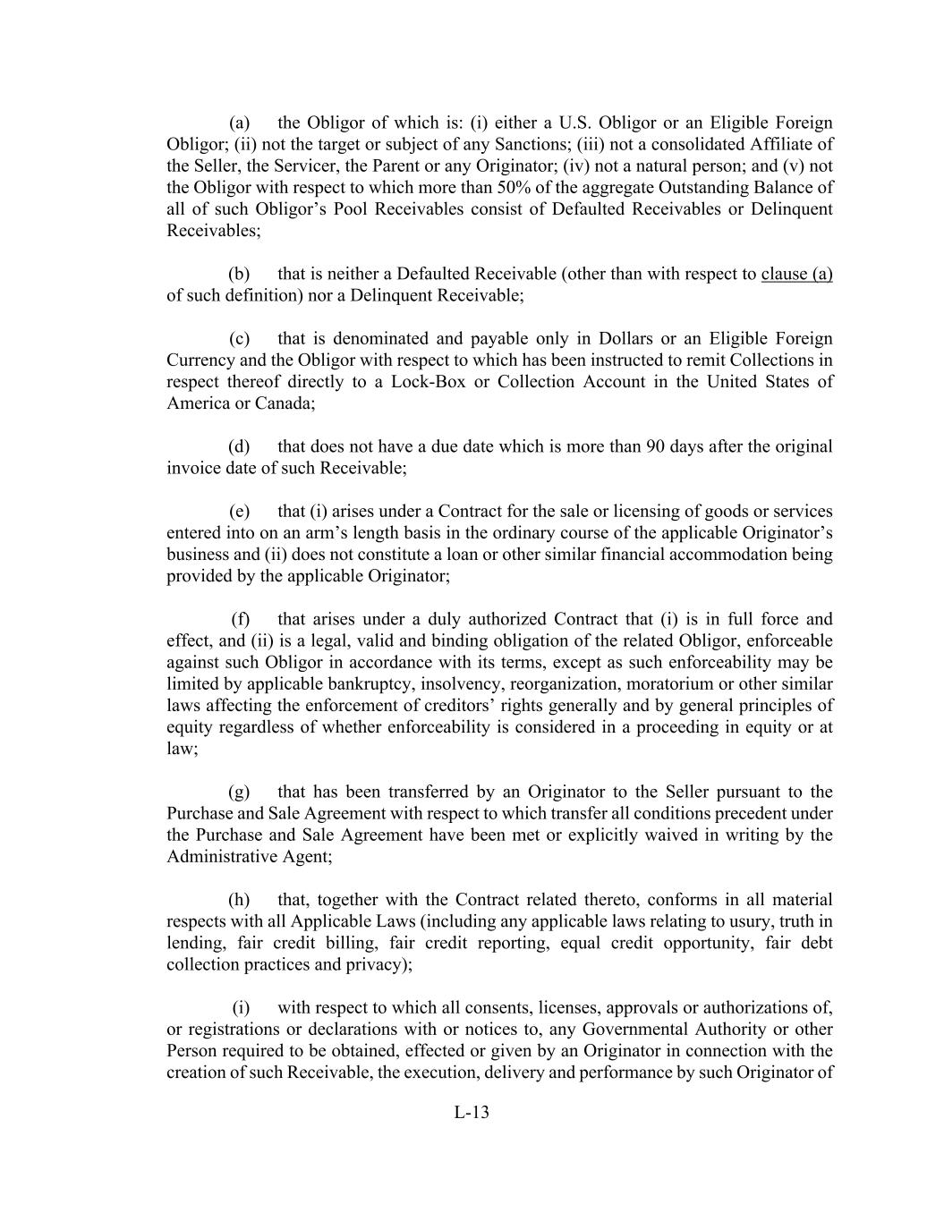 L-13 (a) the Obligor of which is: (i) either a U.S. Obligor or an Eligible Foreign Obligor; (ii) not the target or subject of any Sanctions; (iii) not a consolidated Affiliate of the Seller, the Servicer, the Parent or any Originator; (iv) not a natural person; and (v) not the Obligor with respect to which more than 50% of the aggregate Outstanding Balance of all of such Obligor’s Pool Receivables consist of Defaulted Receivables or Delinquent Receivables; (b) that is neither a Defaulted Receivable (other than with respect to clause (a) of such definition) nor a Delinquent Receivable; (c) that is denominated and payable only in Dollars or an Eligible Foreign Currency and the Obligor with respect to which has been instructed to remit Collections in respect thereof directly to a Lock-Box or Collection Account in the United States of America or Canada; (d) that does not have a due date which is more than 90 days after the original invoice date of such Receivable; (e) that (i) arises under a Contract for the sale or licensing of goods or services entered into on an arm’s length basis in the ordinary course of the applicable Originator’s business and (ii) does not constitute a loan or other similar financial accommodation being provided by the applicable Originator; (f) that arises under a duly authorized Contract that (i) is in full force and effect, and (ii) is a legal, valid and binding obligation of the related Obligor, enforceable against such Obligor in accordance with its terms, except as such enforceability may be limited by applicable bankruptcy, insolvency, reorganization, moratorium or other similar laws affecting the enforcement of creditors’ rights generally and by general principles of equity regardless of whether enforceability is considered in a proceeding in equity or at law; (g) that has been transferred by an Originator to the Seller pursuant to the Purchase and Sale Agreement with respect to which transfer all conditions precedent under the Purchase and Sale Agreement have been met or explicitly waived in writing by the Administrative Agent; (h) that, together with the Contract related thereto, conforms in all material respects with all Applicable Laws (including any applicable laws relating to usury, truth in lending, fair credit billing, fair credit reporting, equal credit opportunity, fair debt collection practices and privacy); (i) with respect to which all consents, licenses, approvals or authorizations of, or registrations or declarations with or notices to, any Governmental Authority or other Person required to be obtained, effected or given by an Originator in connection with the creation of such Receivable, the execution, delivery and performance by such Originator of