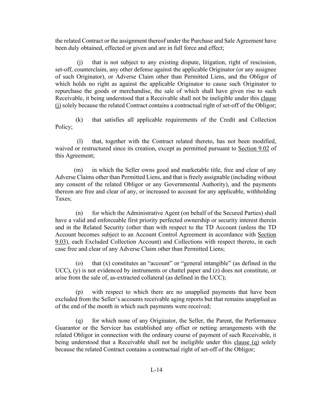 L-14 the related Contract or the assignment thereof under the Purchase and Sale Agreement have been duly obtained, effected or given and are in full force and effect; (j) that is not subject to any existing dispute, litigation, right of rescission, set-off, counterclaim, any other defense against the applicable Originator (or any assignee of such Originator), or Adverse Claim other than Permitted Liens, and the Obligor of which holds no right as against the applicable Originator to cause such Originator to repurchase the goods or merchandise, the sale of which shall have given rise to such Receivable, it being understood that a Receivable shall not be ineligible under this clause (j) solely because the related Contract contains a contractual right of set-off of the Obligor; (k) that satisfies all applicable requirements of the Credit and Collection Policy; (l) that, together with the Contract related thereto, has not been modified, waived or restructured since its creation, except as permitted pursuant to Section 9.02 of this Agreement; (m) in which the Seller owns good and marketable title, free and clear of any Adverse Claims other than Permitted Liens, and that is freely assignable (including without any consent of the related Obligor or any Governmental Authority), and the payments thereon are free and clear of any, or increased to account for any applicable, withholding Taxes; (n) for which the Administrative Agent (on behalf of the Secured Parties) shall have a valid and enforceable first priority perfected ownership or security interest therein and in the Related Security (other than with respect to the TD Account (unless the TD Account becomes subject to an Account Control Agreement in accordance with Section 9.03), each Excluded Collection Account) and Collections with respect thereto, in each case free and clear of any Adverse Claim other than Permitted Liens; (o) that (x) constitutes an “account” or “general intangible” (as defined in the UCC), (y) is not evidenced by instruments or chattel paper and (z) does not constitute, or arise from the sale of, as-extracted collateral (as defined in the UCC); (p) with respect to which there are no unapplied payments that have been excluded from the Seller’s accounts receivable aging reports but that remains unapplied as of the end of the month in which such payments were received; (q) for which none of any Originator, the Seller, the Parent, the Performance Guarantor or the Servicer has established any offset or netting arrangements with the related Obligor in connection with the ordinary course of payment of such Receivable, it being understood that a Receivable shall not be ineligible under this clause (q) solely because the related Contract contains a contractual right of set-off of the Obligor;