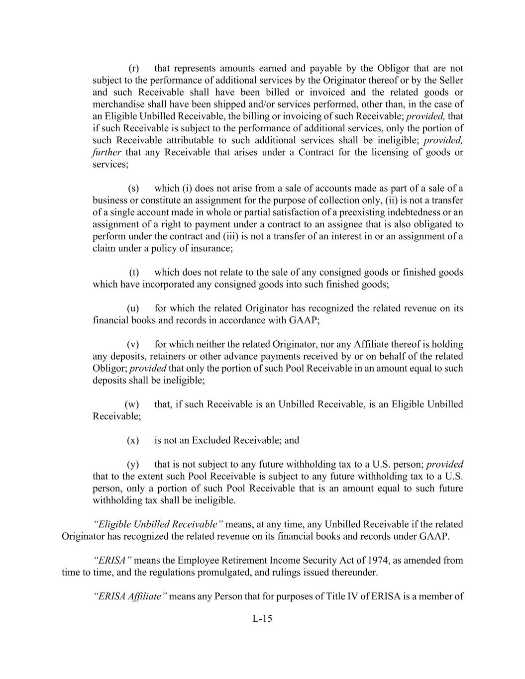L-15 (r) that represents amounts earned and payable by the Obligor that are not subject to the performance of additional services by the Originator thereof or by the Seller and such Receivable shall have been billed or invoiced and the related goods or merchandise shall have been shipped and/or services performed, other than, in the case of an Eligible Unbilled Receivable, the billing or invoicing of such Receivable; provided, that if such Receivable is subject to the performance of additional services, only the portion of such Receivable attributable to such additional services shall be ineligible; provided, further that any Receivable that arises under a Contract for the licensing of goods or services; (s) which (i) does not arise from a sale of accounts made as part of a sale of a business or constitute an assignment for the purpose of collection only, (ii) is not a transfer of a single account made in whole or partial satisfaction of a preexisting indebtedness or an assignment of a right to payment under a contract to an assignee that is also obligated to perform under the contract and (iii) is not a transfer of an interest in or an assignment of a claim under a policy of insurance; (t) which does not relate to the sale of any consigned goods or finished goods which have incorporated any consigned goods into such finished goods; (u) for which the related Originator has recognized the related revenue on its financial books and records in accordance with GAAP; (v) for which neither the related Originator, nor any Affiliate thereof is holding any deposits, retainers or other advance payments received by or on behalf of the related Obligor; provided that only the portion of such Pool Receivable in an amount equal to such deposits shall be ineligible; (w) that, if such Receivable is an Unbilled Receivable, is an Eligible Unbilled Receivable; (x) is not an Excluded Receivable; and (y) that is not subject to any future withholding tax to a U.S. person; provided that to the extent such Pool Receivable is subject to any future withholding tax to a U.S. person, only a portion of such Pool Receivable that is an amount equal to such future withholding tax shall be ineligible. “Eligible Unbilled Receivable” means, at any time, any Unbilled Receivable if the related Originator has recognized the related revenue on its financial books and records under GAAP. “ERISA” means the Employee Retirement Income Security Act of 1974, as amended from time to time, and the regulations promulgated, and rulings issued thereunder. “ERISA Affiliate” means any Person that for purposes of Title IV of ERISA is a member of