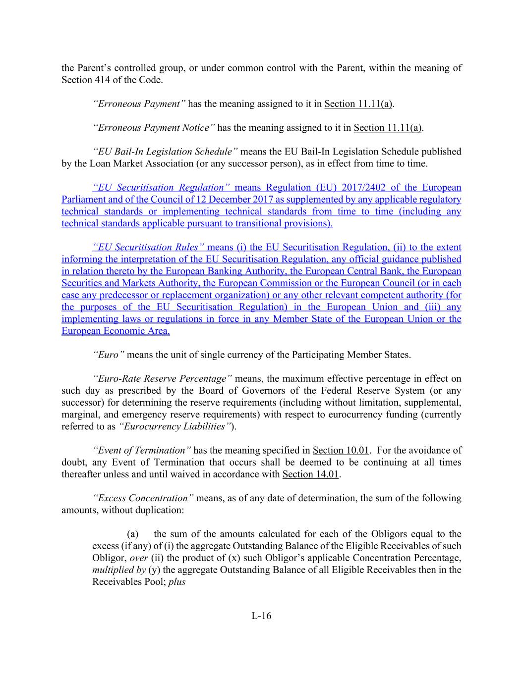 L-16 the Parent’s controlled group, or under common control with the Parent, within the meaning of Section 414 of the Code. “Erroneous Payment” has the meaning assigned to it in Section 11.11(a). “Erroneous Payment Notice” has the meaning assigned to it in Section 11.11(a). “EU Bail-In Legislation Schedule” means the EU Bail-In Legislation Schedule published by the Loan Market Association (or any successor person), as in effect from time to time. “EU Securitisation Regulation” means Regulation (EU) 2017/2402 of the European Parliament and of the Council of 12 December 2017 as supplemented by any applicable regulatory technical standards or implementing technical standards from time to time (including any technical standards applicable pursuant to transitional provisions). “EU Securitisation Rules” means (i) the EU Securitisation Regulation, (ii) to the extent informing the interpretation of the EU Securitisation Regulation, any official guidance published in relation thereto by the European Banking Authority, the European Central Bank, the European Securities and Markets Authority, the European Commission or the European Council (or in each case any predecessor or replacement organization) or any other relevant competent authority (for the purposes of the EU Securitisation Regulation) in the European Union and (iii) any implementing laws or regulations in force in any Member State of the European Union or the European Economic Area. “Euro” means the unit of single currency of the Participating Member States. “Euro-Rate Reserve Percentage” means, the maximum effective percentage in effect on such day as prescribed by the Board of Governors of the Federal Reserve System (or any successor) for determining the reserve requirements (including without limitation, supplemental, marginal, and emergency reserve requirements) with respect to eurocurrency funding (currently referred to as “Eurocurrency Liabilities”). “Event of Termination” has the meaning specified in Section 10.01. For the avoidance of doubt, any Event of Termination that occurs shall be deemed to be continuing at all times thereafter unless and until waived in accordance with Section 14.01. “Excess Concentration” means, as of any date of determination, the sum of the following amounts, without duplication: (a) the sum of the amounts calculated for each of the Obligors equal to the excess (if any) of (i) the aggregate Outstanding Balance of the Eligible Receivables of such Obligor, over (ii) the product of (x) such Obligor’s applicable Concentration Percentage, multiplied by (y) the aggregate Outstanding Balance of all Eligible Receivables then in the Receivables Pool; plus