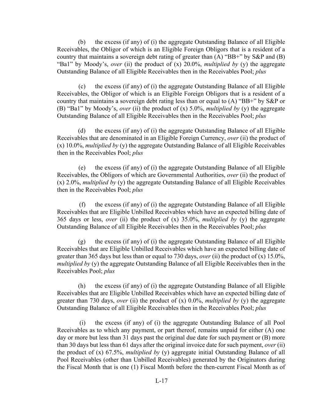 L-17 (b) the excess (if any) of (i) the aggregate Outstanding Balance of all Eligible Receivables, the Obligor of which is an Eligible Foreign Obligors that is a resident of a country that maintains a sovereign debt rating of greater than (A) “BB+” by S&P and (B) “Ba1” by Moody’s, over (ii) the product of (x) 20.0%, multiplied by (y) the aggregate Outstanding Balance of all Eligible Receivables then in the Receivables Pool; plus (c) the excess (if any) of (i) the aggregate Outstanding Balance of all Eligible Receivables, the Obligor of which is an Eligible Foreign Obligors that is a resident of a country that maintains a sovereign debt rating less than or equal to (A) “BB+” by S&P or (B) “Ba1” by Moody’s, over (ii) the product of (x) 5.0%, multiplied by (y) the aggregate Outstanding Balance of all Eligible Receivables then in the Receivables Pool; plus (d) the excess (if any) of (i) the aggregate Outstanding Balance of all Eligible Receivables that are denominated in an Eligible Foreign Currency, over (ii) the product of (x) 10.0%, multiplied by (y) the aggregate Outstanding Balance of all Eligible Receivables then in the Receivables Pool; plus (e) the excess (if any) of (i) the aggregate Outstanding Balance of all Eligible Receivables, the Obligors of which are Governmental Authorities, over (ii) the product of (x) 2.0%, multiplied by (y) the aggregate Outstanding Balance of all Eligible Receivables then in the Receivables Pool; plus (f) the excess (if any) of (i) the aggregate Outstanding Balance of all Eligible Receivables that are Eligible Unbilled Receivables which have an expected billing date of 365 days or less, over (ii) the product of (x) 35.0%, multiplied by (y) the aggregate Outstanding Balance of all Eligible Receivables then in the Receivables Pool; plus (g) the excess (if any) of (i) the aggregate Outstanding Balance of all Eligible Receivables that are Eligible Unbilled Receivables which have an expected billing date of greater than 365 days but less than or equal to 730 days, over (ii) the product of (x) 15.0%, multiplied by (y) the aggregate Outstanding Balance of all Eligible Receivables then in the Receivables Pool; plus (h) the excess (if any) of (i) the aggregate Outstanding Balance of all Eligible Receivables that are Eligible Unbilled Receivables which have an expected billing date of greater than 730 days, over (ii) the product of (x) 0.0%, multiplied by (y) the aggregate Outstanding Balance of all Eligible Receivables then in the Receivables Pool; plus (i) the excess (if any) of (i) the aggregate Outstanding Balance of all Pool Receivables as to which any payment, or part thereof, remains unpaid for either (A) one day or more but less than 31 days past the original due date for such payment or (B) more than 30 days but less than 61 days after the original invoice date for such payment, over (ii) the product of (x) 67.5%, multiplied by (y) aggregate initial Outstanding Balance of all Pool Receivables (other than Unbilled Receivables) generated by the Originators during the Fiscal Month that is one (1) Fiscal Month before the then-current Fiscal Month as of