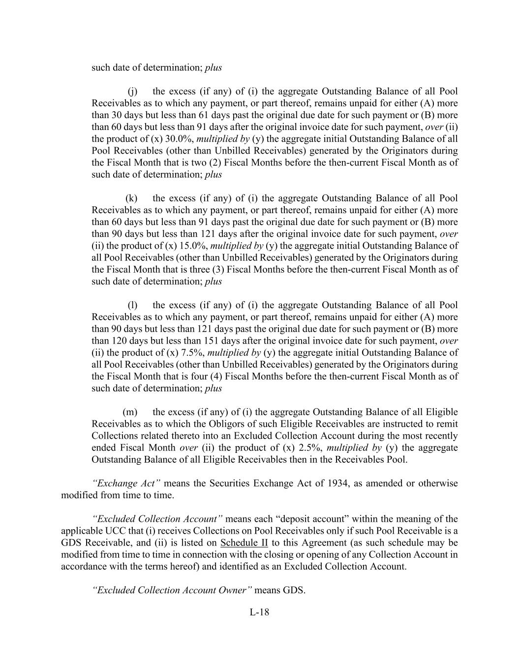 L-18 such date of determination; plus (j) the excess (if any) of (i) the aggregate Outstanding Balance of all Pool Receivables as to which any payment, or part thereof, remains unpaid for either (A) more than 30 days but less than 61 days past the original due date for such payment or (B) more than 60 days but less than 91 days after the original invoice date for such payment, over (ii) the product of (x) 30.0%, multiplied by (y) the aggregate initial Outstanding Balance of all Pool Receivables (other than Unbilled Receivables) generated by the Originators during the Fiscal Month that is two (2) Fiscal Months before the then-current Fiscal Month as of such date of determination; plus (k) the excess (if any) of (i) the aggregate Outstanding Balance of all Pool Receivables as to which any payment, or part thereof, remains unpaid for either (A) more than 60 days but less than 91 days past the original due date for such payment or (B) more than 90 days but less than 121 days after the original invoice date for such payment, over (ii) the product of (x) 15.0%, multiplied by (y) the aggregate initial Outstanding Balance of all Pool Receivables (other than Unbilled Receivables) generated by the Originators during the Fiscal Month that is three (3) Fiscal Months before the then-current Fiscal Month as of such date of determination; plus (l) the excess (if any) of (i) the aggregate Outstanding Balance of all Pool Receivables as to which any payment, or part thereof, remains unpaid for either (A) more than 90 days but less than 121 days past the original due date for such payment or (B) more than 120 days but less than 151 days after the original invoice date for such payment, over (ii) the product of (x) 7.5%, multiplied by (y) the aggregate initial Outstanding Balance of all Pool Receivables (other than Unbilled Receivables) generated by the Originators during the Fiscal Month that is four (4) Fiscal Months before the then-current Fiscal Month as of such date of determination; plus (m) the excess (if any) of (i) the aggregate Outstanding Balance of all Eligible Receivables as to which the Obligors of such Eligible Receivables are instructed to remit Collections related thereto into an Excluded Collection Account during the most recently ended Fiscal Month over (ii) the product of (x) 2.5%, multiplied by (y) the aggregate Outstanding Balance of all Eligible Receivables then in the Receivables Pool. “Exchange Act” means the Securities Exchange Act of 1934, as amended or otherwise modified from time to time. “Excluded Collection Account” means each “deposit account” within the meaning of the applicable UCC that (i) receives Collections on Pool Receivables only if such Pool Receivable is a GDS Receivable, and (ii) is listed on Schedule II to this Agreement (as such schedule may be modified from time to time in connection with the closing or opening of any Collection Account in accordance with the terms hereof) and identified as an Excluded Collection Account. “Excluded Collection Account Owner” means GDS.