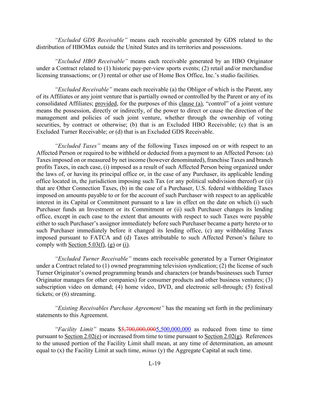 L-19 “Excluded GDS Receivable” means each receivable generated by GDS related to the distribution of HBOMax outside the United States and its territories and possessions. “Excluded HBO Receivable” means each receivable generated by an HBO Originator under a Contract related to (1) historic pay-per-view sports events; (2) retail and/or merchandise licensing transactions; or (3) rental or other use of Home Box Office, Inc.’s studio facilities. “Excluded Receivable” means each receivable (a) the Obligor of which is the Parent, any of its Affiliates or any joint venture that is partially owned or controlled by the Parent or any of its consolidated Affiliates; provided, for the purposes of this clause (a), “control” of a joint venture means the possession, directly or indirectly, of the power to direct or cause the direction of the management and policies of such joint venture, whether through the ownership of voting securities, by contract or otherwise; (b) that is an Excluded HBO Receivable; (c) that is an Excluded Turner Receivable; or (d) that is an Excluded GDS Receivable. “Excluded Taxes” means any of the following Taxes imposed on or with respect to an Affected Person or required to be withheld or deducted from a payment to an Affected Person: (a) Taxes imposed on or measured by net income (however denominated), franchise Taxes and branch profits Taxes, in each case, (i) imposed as a result of such Affected Person being organized under the laws of, or having its principal office or, in the case of any Purchaser, its applicable lending office located in, the jurisdiction imposing such Tax (or any political subdivision thereof) or (ii) that are Other Connection Taxes, (b) in the case of a Purchaser, U.S. federal withholding Taxes imposed on amounts payable to or for the account of such Purchaser with respect to an applicable interest in its Capital or Commitment pursuant to a law in effect on the date on which (i) such Purchaser funds an Investment or its Commitment or (ii) such Purchaser changes its lending office, except in each case to the extent that amounts with respect to such Taxes were payable either to such Purchaser’s assignor immediately before such Purchaser became a party hereto or to such Purchaser immediately before it changed its lending office, (c) any withholding Taxes imposed pursuant to FATCA and (d) Taxes attributable to such Affected Person’s failure to comply with Section 5.03(f), (g) or (i). “Excluded Turner Receivable” means each receivable generated by a Turner Originator under a Contract related to (1) owned programming television syndication; (2) the license of such Turner Originator’s owned programming brands and characters (or brands/businesses such Turner Originator manages for other companies) for consumer products and other business ventures; (3) subscription video on demand; (4) home video, DVD, and electronic sell-through; (5) festival tickets; or (6) streaming. “Existing Receivables Purchase Agreement” has the meaning set forth in the preliminary statements to this Agreement. “Facility Limit” means $5,700,000,0005,500,000,000 as reduced from time to time pursuant to Section 2.02(e) or increased from time to time pursuant to Section 2.02(g). References to the unused portion of the Facility Limit shall mean, at any time of determination, an amount equal to (x) the Facility Limit at such time, minus (y) the Aggregate Capital at such time.