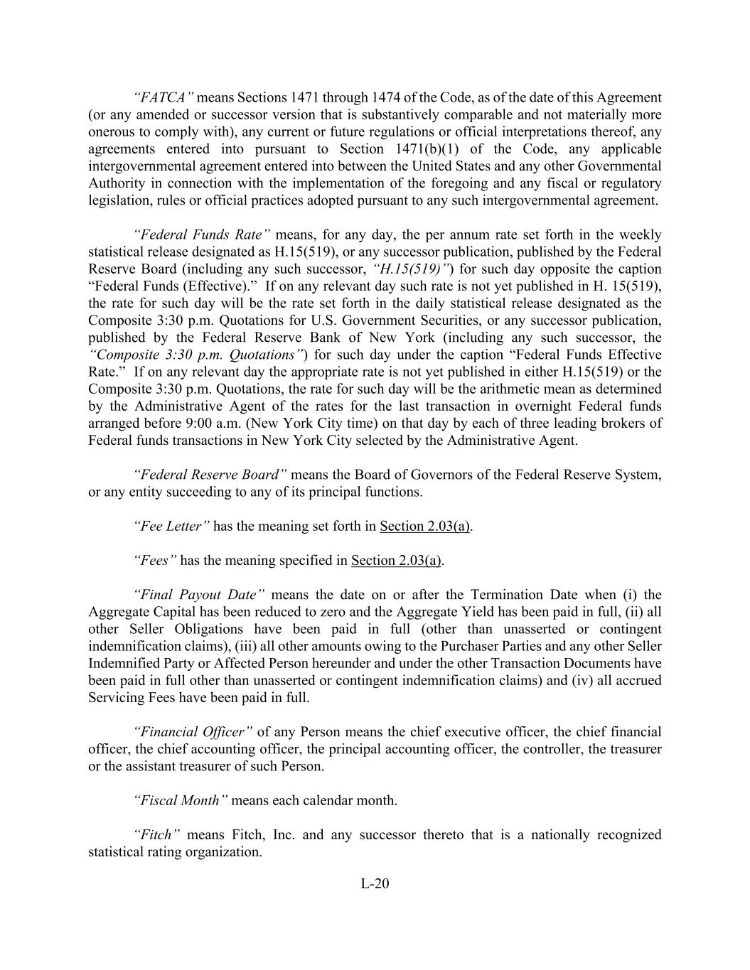 L-20 “FATCA” means Sections 1471 through 1474 of the Code, as of the date of this Agreement (or any amended or successor version that is substantively comparable and not materially more onerous to comply with), any current or future regulations or official interpretations thereof, any agreements entered into pursuant to Section 1471(b)(1) of the Code, any applicable intergovernmental agreement entered into between the United States and any other Governmental Authority in connection with the implementation of the foregoing and any fiscal or regulatory legislation, rules or official practices adopted pursuant to any such intergovernmental agreement. “Federal Funds Rate” means, for any day, the per annum rate set forth in the weekly statistical release designated as H.15(519), or any successor publication, published by the Federal Reserve Board (including any such successor, “H.15(519)”) for such day opposite the caption “Federal Funds (Effective).” If on any relevant day such rate is not yet published in H. 15(519), the rate for such day will be the rate set forth in the daily statistical release designated as the Composite 3:30 p.m. Quotations for U.S. Government Securities, or any successor publication, published by the Federal Reserve Bank of New York (including any such successor, the “Composite 3:30 p.m. Quotations”) for such day under the caption “Federal Funds Effective Rate.” If on any relevant day the appropriate rate is not yet published in either H.15(519) or the Composite 3:30 p.m. Quotations, the rate for such day will be the arithmetic mean as determined by the Administrative Agent of the rates for the last transaction in overnight Federal funds arranged before 9:00 a.m. (New York City time) on that day by each of three leading brokers of Federal funds transactions in New York City selected by the Administrative Agent. “Federal Reserve Board” means the Board of Governors of the Federal Reserve System, or any entity succeeding to any of its principal functions. “Fee Letter” has the meaning set forth in Section 2.03(a). “Fees” has the meaning specified in Section 2.03(a). “Final Payout Date” means the date on or after the Termination Date when (i) the Aggregate Capital has been reduced to zero and the Aggregate Yield has been paid in full, (ii) all other Seller Obligations have been paid in full (other than unasserted or contingent indemnification claims), (iii) all other amounts owing to the Purchaser Parties and any other Seller Indemnified Party or Affected Person hereunder and under the other Transaction Documents have been paid in full other than unasserted or contingent indemnification claims) and (iv) all accrued Servicing Fees have been paid in full. “Financial Officer” of any Person means the chief executive officer, the chief financial officer, the chief accounting officer, the principal accounting officer, the controller, the treasurer or the assistant treasurer of such Person. “Fiscal Month” means each calendar month. “Fitch” means Fitch, Inc. and any successor thereto that is a nationally recognized statistical rating organization.