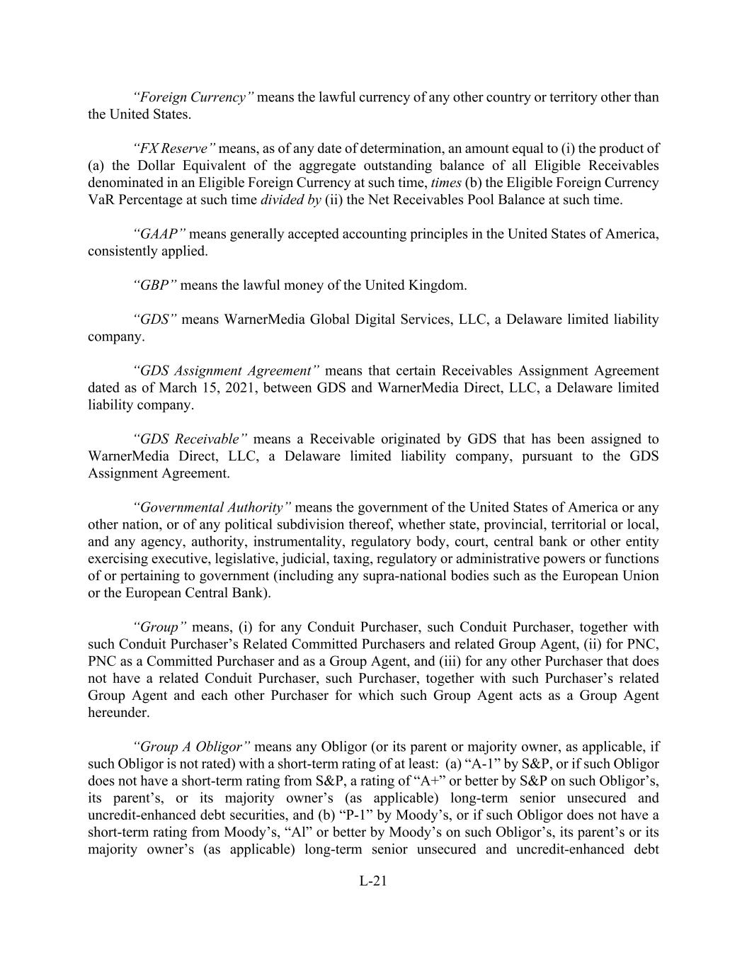 L-21 “Foreign Currency” means the lawful currency of any other country or territory other than the United States. “FX Reserve” means, as of any date of determination, an amount equal to (i) the product of (a) the Dollar Equivalent of the aggregate outstanding balance of all Eligible Receivables denominated in an Eligible Foreign Currency at such time, times (b) the Eligible Foreign Currency VaR Percentage at such time divided by (ii) the Net Receivables Pool Balance at such time. “GAAP” means generally accepted accounting principles in the United States of America, consistently applied. “GBP” means the lawful money of the United Kingdom. “GDS” means WarnerMedia Global Digital Services, LLC, a Delaware limited liability company. “GDS Assignment Agreement” means that certain Receivables Assignment Agreement dated as of March 15, 2021, between GDS and WarnerMedia Direct, LLC, a Delaware limited liability company. “GDS Receivable” means a Receivable originated by GDS that has been assigned to WarnerMedia Direct, LLC, a Delaware limited liability company, pursuant to the GDS Assignment Agreement. “Governmental Authority” means the government of the United States of America or any other nation, or of any political subdivision thereof, whether state, provincial, territorial or local, and any agency, authority, instrumentality, regulatory body, court, central bank or other entity exercising executive, legislative, judicial, taxing, regulatory or administrative powers or functions of or pertaining to government (including any supra-national bodies such as the European Union or the European Central Bank). “Group” means, (i) for any Conduit Purchaser, such Conduit Purchaser, together with such Conduit Purchaser’s Related Committed Purchasers and related Group Agent, (ii) for PNC, PNC as a Committed Purchaser and as a Group Agent, and (iii) for any other Purchaser that does not have a related Conduit Purchaser, such Purchaser, together with such Purchaser’s related Group Agent and each other Purchaser for which such Group Agent acts as a Group Agent hereunder. “Group A Obligor” means any Obligor (or its parent or majority owner, as applicable, if such Obligor is not rated) with a short-term rating of at least: (a) “A-1” by S&P, or if such Obligor does not have a short-term rating from S&P, a rating of “A+” or better by S&P on such Obligor’s, its parent’s, or its majority owner’s (as applicable) long-term senior unsecured and uncredit-enhanced debt securities, and (b) “P-1” by Moody’s, or if such Obligor does not have a short-term rating from Moody’s, “Al” or better by Moody’s on such Obligor’s, its parent’s or its majority owner’s (as applicable) long-term senior unsecured and uncredit-enhanced debt