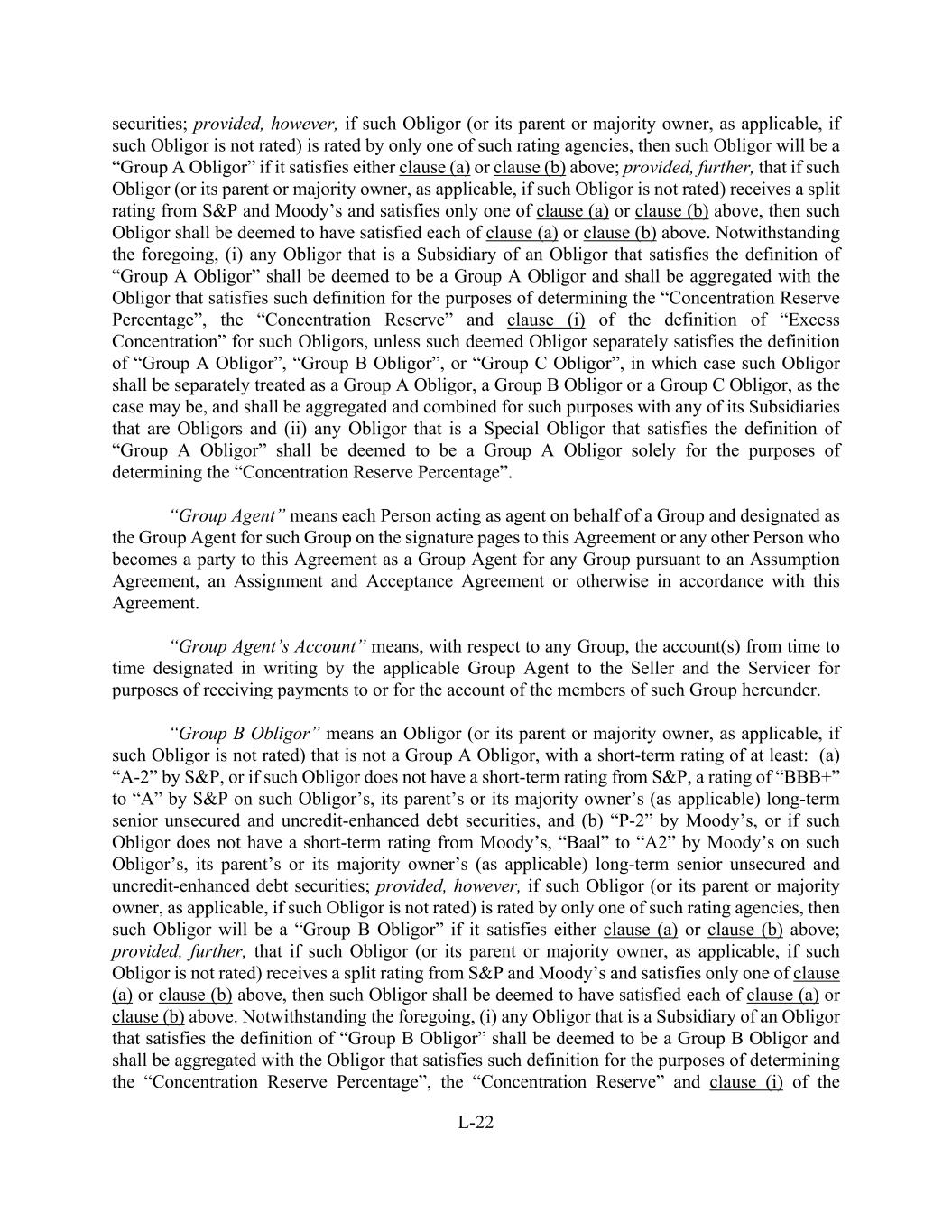 L-22 securities; provided, however, if such Obligor (or its parent or majority owner, as applicable, if such Obligor is not rated) is rated by only one of such rating agencies, then such Obligor will be a “Group A Obligor” if it satisfies either clause (a) or clause (b) above; provided, further, that if such Obligor (or its parent or majority owner, as applicable, if such Obligor is not rated) receives a split rating from S&P and Moody’s and satisfies only one of clause (a) or clause (b) above, then such Obligor shall be deemed to have satisfied each of clause (a) or clause (b) above. Notwithstanding the foregoing, (i) any Obligor that is a Subsidiary of an Obligor that satisfies the definition of “Group A Obligor” shall be deemed to be a Group A Obligor and shall be aggregated with the Obligor that satisfies such definition for the purposes of determining the “Concentration Reserve Percentage”, the “Concentration Reserve” and clause (i) of the definition of “Excess Concentration” for such Obligors, unless such deemed Obligor separately satisfies the definition of “Group A Obligor”, “Group B Obligor”, or “Group C Obligor”, in which case such Obligor shall be separately treated as a Group A Obligor, a Group B Obligor or a Group C Obligor, as the case may be, and shall be aggregated and combined for such purposes with any of its Subsidiaries that are Obligors and (ii) any Obligor that is a Special Obligor that satisfies the definition of “Group A Obligor” shall be deemed to be a Group A Obligor solely for the purposes of determining the “Concentration Reserve Percentage”. “Group Agent” means each Person acting as agent on behalf of a Group and designated as the Group Agent for such Group on the signature pages to this Agreement or any other Person who becomes a party to this Agreement as a Group Agent for any Group pursuant to an Assumption Agreement, an Assignment and Acceptance Agreement or otherwise in accordance with this Agreement. “Group Agent’s Account” means, with respect to any Group, the account(s) from time to time designated in writing by the applicable Group Agent to the Seller and the Servicer for purposes of receiving payments to or for the account of the members of such Group hereunder. “Group B Obligor” means an Obligor (or its parent or majority owner, as applicable, if such Obligor is not rated) that is not a Group A Obligor, with a short-term rating of at least: (a) “A-2” by S&P, or if such Obligor does not have a short-term rating from S&P, a rating of “BBB+” to “A” by S&P on such Obligor’s, its parent’s or its majority owner’s (as applicable) long-term senior unsecured and uncredit-enhanced debt securities, and (b) “P-2” by Moody’s, or if such Obligor does not have a short-term rating from Moody’s, “Baal” to “A2” by Moody’s on such Obligor’s, its parent’s or its majority owner’s (as applicable) long-term senior unsecured and uncredit-enhanced debt securities; provided, however, if such Obligor (or its parent or majority owner, as applicable, if such Obligor is not rated) is rated by only one of such rating agencies, then such Obligor will be a “Group B Obligor” if it satisfies either clause (a) or clause (b) above; provided, further, that if such Obligor (or its parent or majority owner, as applicable, if such Obligor is not rated) receives a split rating from S&P and Moody’s and satisfies only one of clause (a) or clause (b) above, then such Obligor shall be deemed to have satisfied each of clause (a) or clause (b) above. Notwithstanding the foregoing, (i) any Obligor that is a Subsidiary of an Obligor that satisfies the definition of “Group B Obligor” shall be deemed to be a Group B Obligor and shall be aggregated with the Obligor that satisfies such definition for the purposes of determining the “Concentration Reserve Percentage”, the “Concentration Reserve” and clause (i) of the