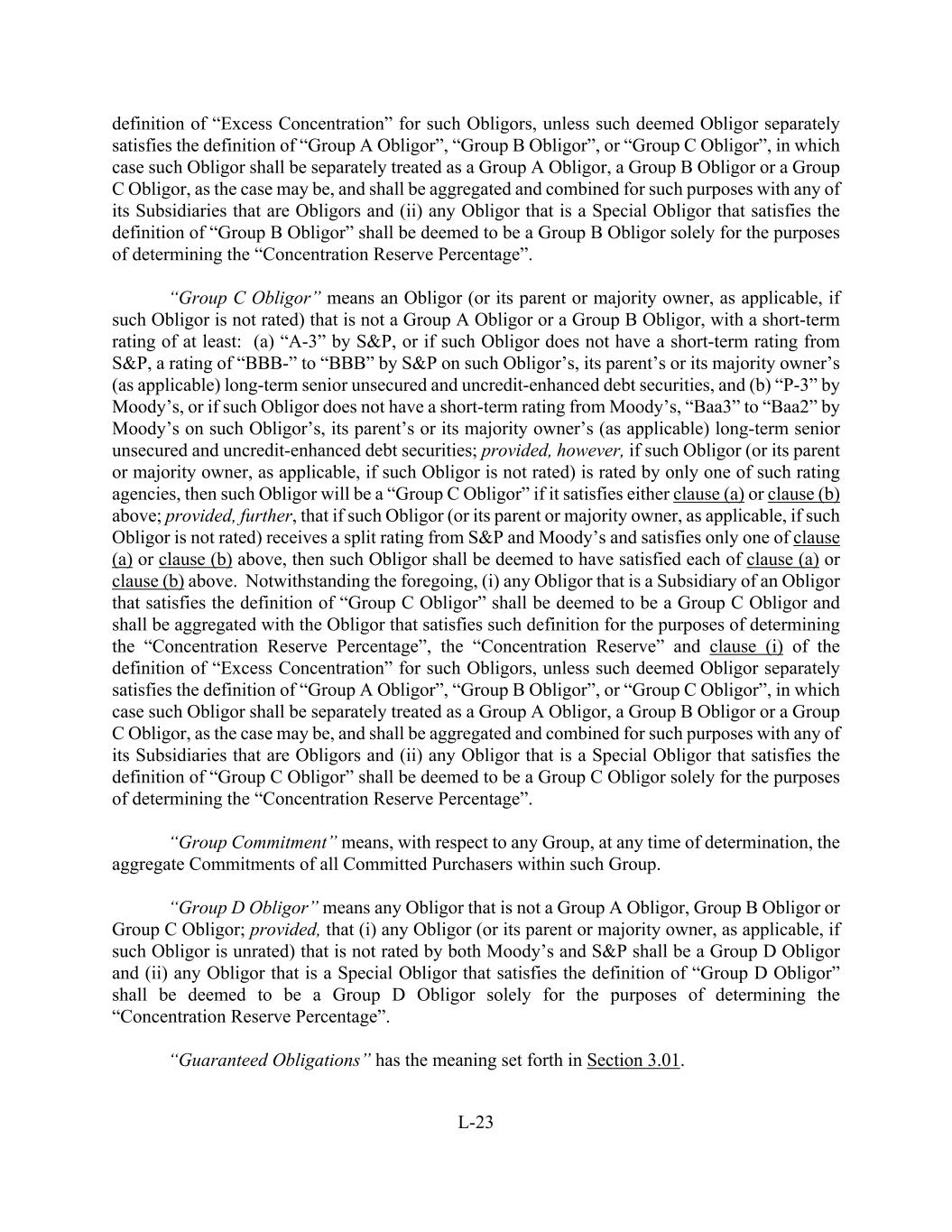 L-23 definition of “Excess Concentration” for such Obligors, unless such deemed Obligor separately satisfies the definition of “Group A Obligor”, “Group B Obligor”, or “Group C Obligor”, in which case such Obligor shall be separately treated as a Group A Obligor, a Group B Obligor or a Group C Obligor, as the case may be, and shall be aggregated and combined for such purposes with any of its Subsidiaries that are Obligors and (ii) any Obligor that is a Special Obligor that satisfies the definition of “Group B Obligor” shall be deemed to be a Group B Obligor solely for the purposes of determining the “Concentration Reserve Percentage”. “Group C Obligor” means an Obligor (or its parent or majority owner, as applicable, if such Obligor is not rated) that is not a Group A Obligor or a Group B Obligor, with a short-term rating of at least: (a) “A-3” by S&P, or if such Obligor does not have a short-term rating from S&P, a rating of “BBB-” to “BBB” by S&P on such Obligor’s, its parent’s or its majority owner’s (as applicable) long-term senior unsecured and uncredit-enhanced debt securities, and (b) “P-3” by Moody’s, or if such Obligor does not have a short-term rating from Moody’s, “Baa3” to “Baa2” by Moody’s on such Obligor’s, its parent’s or its majority owner’s (as applicable) long-term senior unsecured and uncredit-enhanced debt securities; provided, however, if such Obligor (or its parent or majority owner, as applicable, if such Obligor is not rated) is rated by only one of such rating agencies, then such Obligor will be a “Group C Obligor” if it satisfies either clause (a) or clause (b) above; provided, further, that if such Obligor (or its parent or majority owner, as applicable, if such Obligor is not rated) receives a split rating from S&P and Moody’s and satisfies only one of clause (a) or clause (b) above, then such Obligor shall be deemed to have satisfied each of clause (a) or clause (b) above. Notwithstanding the foregoing, (i) any Obligor that is a Subsidiary of an Obligor that satisfies the definition of “Group C Obligor” shall be deemed to be a Group C Obligor and shall be aggregated with the Obligor that satisfies such definition for the purposes of determining the “Concentration Reserve Percentage”, the “Concentration Reserve” and clause (i) of the definition of “Excess Concentration” for such Obligors, unless such deemed Obligor separately satisfies the definition of “Group A Obligor”, “Group B Obligor”, or “Group C Obligor”, in which case such Obligor shall be separately treated as a Group A Obligor, a Group B Obligor or a Group C Obligor, as the case may be, and shall be aggregated and combined for such purposes with any of its Subsidiaries that are Obligors and (ii) any Obligor that is a Special Obligor that satisfies the definition of “Group C Obligor” shall be deemed to be a Group C Obligor solely for the purposes of determining the “Concentration Reserve Percentage”. “Group Commitment” means, with respect to any Group, at any time of determination, the aggregate Commitments of all Committed Purchasers within such Group. “Group D Obligor” means any Obligor that is not a Group A Obligor, Group B Obligor or Group C Obligor; provided, that (i) any Obligor (or its parent or majority owner, as applicable, if such Obligor is unrated) that is not rated by both Moody’s and S&P shall be a Group D Obligor and (ii) any Obligor that is a Special Obligor that satisfies the definition of “Group D Obligor” shall be deemed to be a Group D Obligor solely for the purposes of determining the “Concentration Reserve Percentage”. “Guaranteed Obligations” has the meaning set forth in Section 3.01.