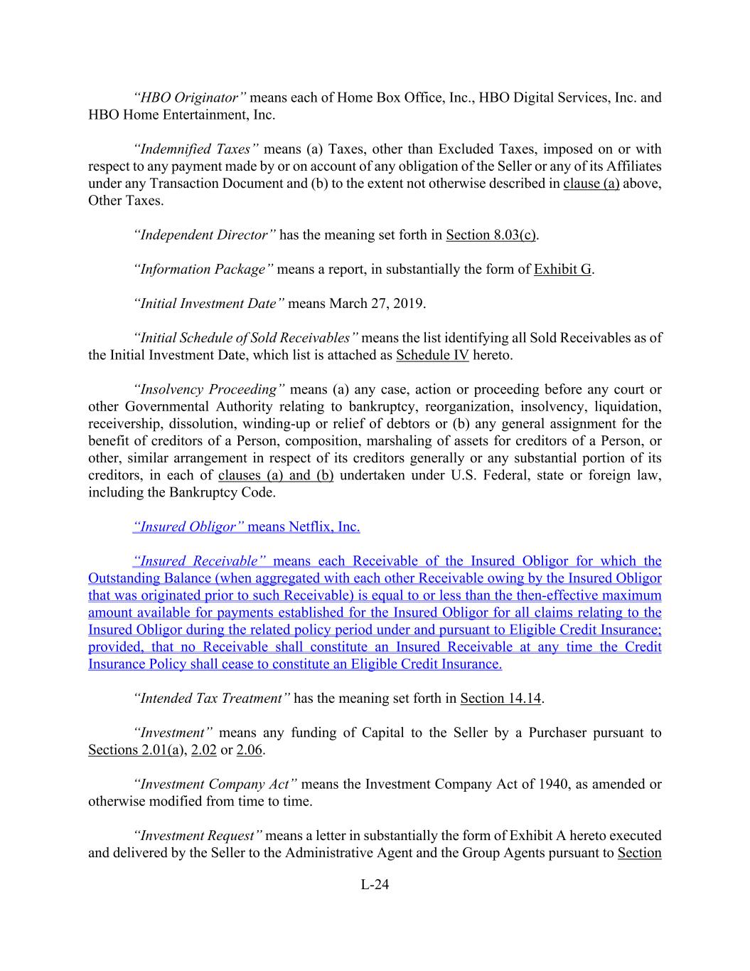 L-24 “HBO Originator” means each of Home Box Office, Inc., HBO Digital Services, Inc. and HBO Home Entertainment, Inc. “Indemnified Taxes” means (a) Taxes, other than Excluded Taxes, imposed on or with respect to any payment made by or on account of any obligation of the Seller or any of its Affiliates under any Transaction Document and (b) to the extent not otherwise described in clause (a) above, Other Taxes. “Independent Director” has the meaning set forth in Section 8.03(c). “Information Package” means a report, in substantially the form of Exhibit G. “Initial Investment Date” means March 27, 2019. “Initial Schedule of Sold Receivables” means the list identifying all Sold Receivables as of the Initial Investment Date, which list is attached as Schedule IV hereto. “Insolvency Proceeding” means (a) any case, action or proceeding before any court or other Governmental Authority relating to bankruptcy, reorganization, insolvency, liquidation, receivership, dissolution, winding-up or relief of debtors or (b) any general assignment for the benefit of creditors of a Person, composition, marshaling of assets for creditors of a Person, or other, similar arrangement in respect of its creditors generally or any substantial portion of its creditors, in each of clauses (a) and (b) undertaken under U.S. Federal, state or foreign law, including the Bankruptcy Code. “Insured Obligor” means Netflix, Inc. “Insured Receivable” means each Receivable of the Insured Obligor for which the Outstanding Balance (when aggregated with each other Receivable owing by the Insured Obligor that was originated prior to such Receivable) is equal to or less than the then-effective maximum amount available for payments established for the Insured Obligor for all claims relating to the Insured Obligor during the related policy period under and pursuant to Eligible Credit Insurance; provided, that no Receivable shall constitute an Insured Receivable at any time the Credit Insurance Policy shall cease to constitute an Eligible Credit Insurance. “Intended Tax Treatment” has the meaning set forth in Section 14.14. “Investment” means any funding of Capital to the Seller by a Purchaser pursuant to Sections 2.01(a), 2.02 or 2.06. “Investment Company Act” means the Investment Company Act of 1940, as amended or otherwise modified from time to time. “Investment Request” means a letter in substantially the form of Exhibit A hereto executed and delivered by the Seller to the Administrative Agent and the Group Agents pursuant to Section