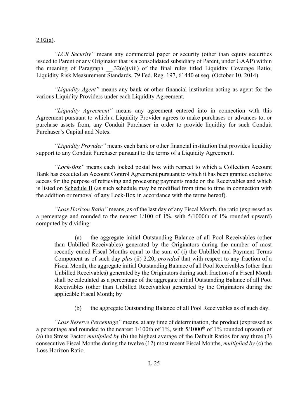 L-25 2.02(a). “LCR Security” means any commercial paper or security (other than equity securities issued to Parent or any Originator that is a consolidated subsidiary of Parent, under GAAP) within the meaning of Paragraph __.32(e)(viii) of the final rules titled Liquidity Coverage Ratio; Liquidity Risk Measurement Standards, 79 Fed. Reg. 197, 61440 et seq. (October 10, 2014). “Liquidity Agent” means any bank or other financial institution acting as agent for the various Liquidity Providers under each Liquidity Agreement. “Liquidity Agreement” means any agreement entered into in connection with this Agreement pursuant to which a Liquidity Provider agrees to make purchases or advances to, or purchase assets from, any Conduit Purchaser in order to provide liquidity for such Conduit Purchaser’s Capital and Notes. “Liquidity Provider” means each bank or other financial institution that provides liquidity support to any Conduit Purchaser pursuant to the terms of a Liquidity Agreement. “Lock-Box” means each locked postal box with respect to which a Collection Account Bank has executed an Account Control Agreement pursuant to which it has been granted exclusive access for the purpose of retrieving and processing payments made on the Receivables and which is listed on Schedule II (as such schedule may be modified from time to time in connection with the addition or removal of any Lock-Box in accordance with the terms hereof). “Loss Horizon Ratio” means, as of the last day of any Fiscal Month, the ratio (expressed as a percentage and rounded to the nearest 1/100 of 1%, with 5/1000th of 1% rounded upward) computed by dividing: (a) the aggregate initial Outstanding Balance of all Pool Receivables (other than Unbilled Receivables) generated by the Originators during the number of most recently ended Fiscal Months equal to the sum of (i) the Unbilled and Payment Terms Component as of such day plus (ii) 2.20; provided that with respect to any fraction of a Fiscal Month, the aggregate initial Outstanding Balance of all Pool Receivables (other than Unbilled Receivables) generated by the Originators during such fraction of a Fiscal Month shall be calculated as a percentage of the aggregate initial Outstanding Balance of all Pool Receivables (other than Unbilled Receivables) generated by the Originators during the applicable Fiscal Month; by (b) the aggregate Outstanding Balance of all Pool Receivables as of such day. “Loss Reserve Percentage” means, at any time of determination, the product (expressed as a percentage and rounded to the nearest 1/100th of 1%, with 5/1000th of 1% rounded upward) of (a) the Stress Factor multiplied by (b) the highest average of the Default Ratios for any three (3) consecutive Fiscal Months during the twelve (12) most recent Fiscal Months, multiplied by (c) the Loss Horizon Ratio.