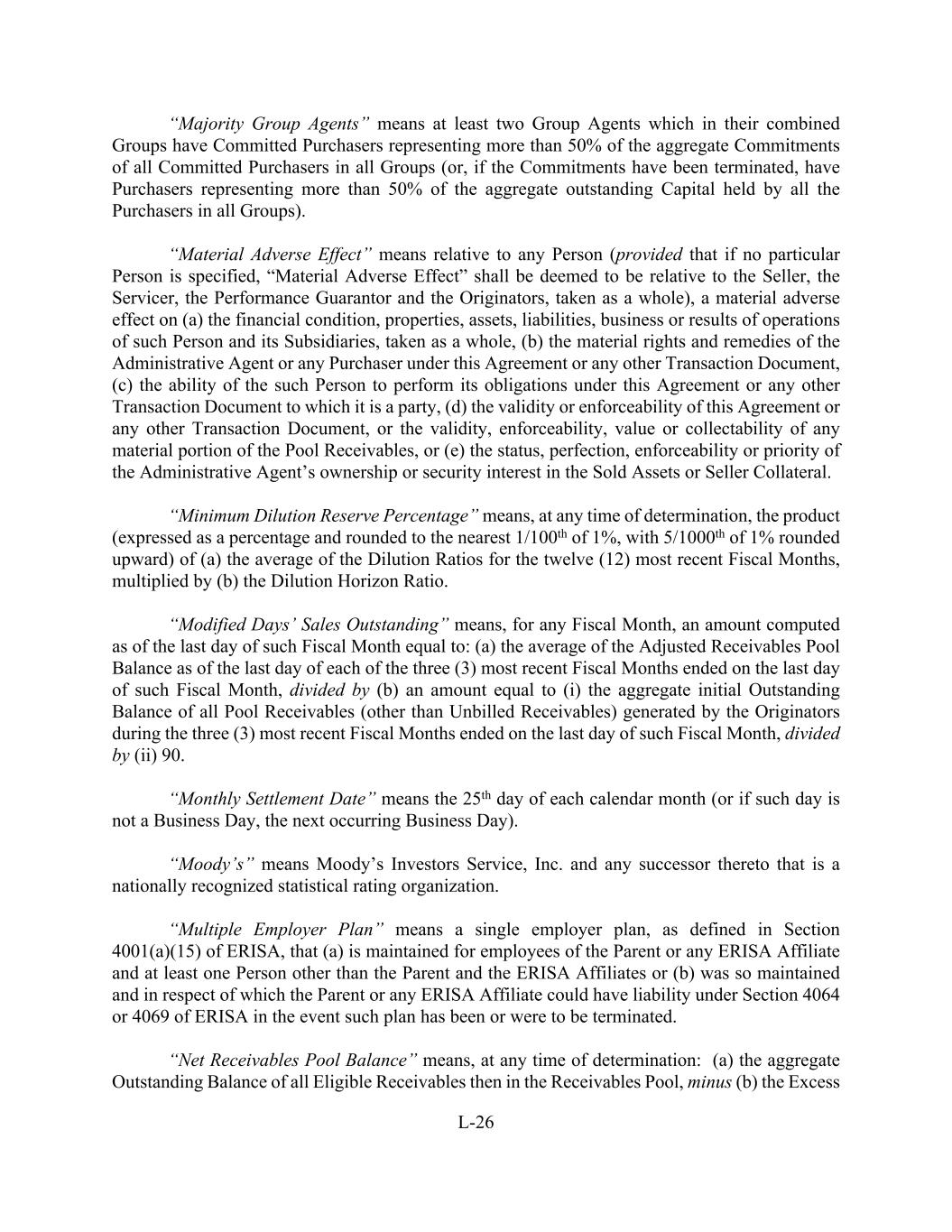 L-26 “Majority Group Agents” means at least two Group Agents which in their combined Groups have Committed Purchasers representing more than 50% of the aggregate Commitments of all Committed Purchasers in all Groups (or, if the Commitments have been terminated, have Purchasers representing more than 50% of the aggregate outstanding Capital held by all the Purchasers in all Groups). “Material Adverse Effect” means relative to any Person (provided that if no particular Person is specified, “Material Adverse Effect” shall be deemed to be relative to the Seller, the Servicer, the Performance Guarantor and the Originators, taken as a whole), a material adverse effect on (a) the financial condition, properties, assets, liabilities, business or results of operations of such Person and its Subsidiaries, taken as a whole, (b) the material rights and remedies of the Administrative Agent or any Purchaser under this Agreement or any other Transaction Document, (c) the ability of the such Person to perform its obligations under this Agreement or any other Transaction Document to which it is a party, (d) the validity or enforceability of this Agreement or any other Transaction Document, or the validity, enforceability, value or collectability of any material portion of the Pool Receivables, or (e) the status, perfection, enforceability or priority of the Administrative Agent’s ownership or security interest in the Sold Assets or Seller Collateral. “Minimum Dilution Reserve Percentage” means, at any time of determination, the product (expressed as a percentage and rounded to the nearest 1/100th of 1%, with 5/1000th of 1% rounded upward) of (a) the average of the Dilution Ratios for the twelve (12) most recent Fiscal Months, multiplied by (b) the Dilution Horizon Ratio. “Modified Days’ Sales Outstanding” means, for any Fiscal Month, an amount computed as of the last day of such Fiscal Month equal to: (a) the average of the Adjusted Receivables Pool Balance as of the last day of each of the three (3) most recent Fiscal Months ended on the last day of such Fiscal Month, divided by (b) an amount equal to (i) the aggregate initial Outstanding Balance of all Pool Receivables (other than Unbilled Receivables) generated by the Originators during the three (3) most recent Fiscal Months ended on the last day of such Fiscal Month, divided by (ii) 90. “Monthly Settlement Date” means the 25th day of each calendar month (or if such day is not a Business Day, the next occurring Business Day). “Moody’s” means Moody’s Investors Service, Inc. and any successor thereto that is a nationally recognized statistical rating organization. “Multiple Employer Plan” means a single employer plan, as defined in Section 4001(a)(15) of ERISA, that (a) is maintained for employees of the Parent or any ERISA Affiliate and at least one Person other than the Parent and the ERISA Affiliates or (b) was so maintained and in respect of which the Parent or any ERISA Affiliate could have liability under Section 4064 or 4069 of ERISA in the event such plan has been or were to be terminated. “Net Receivables Pool Balance” means, at any time of determination: (a) the aggregate Outstanding Balance of all Eligible Receivables then in the Receivables Pool, minus (b) the Excess