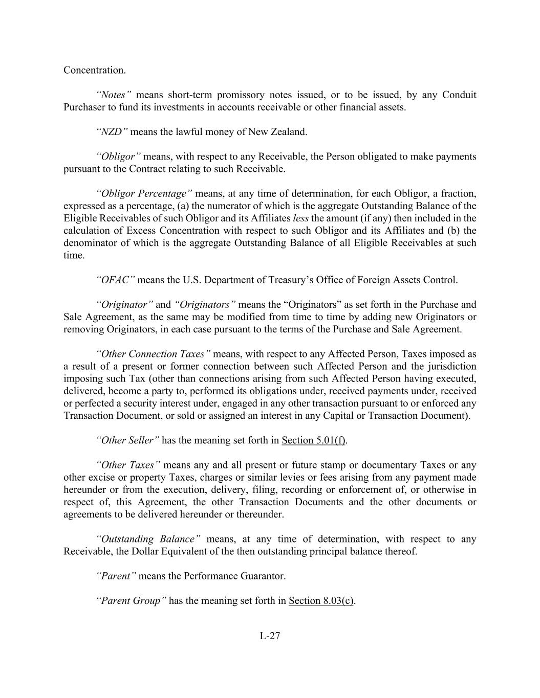 L-27 Concentration. “Notes” means short-term promissory notes issued, or to be issued, by any Conduit Purchaser to fund its investments in accounts receivable or other financial assets. “NZD” means the lawful money of New Zealand. “Obligor” means, with respect to any Receivable, the Person obligated to make payments pursuant to the Contract relating to such Receivable. “Obligor Percentage” means, at any time of determination, for each Obligor, a fraction, expressed as a percentage, (a) the numerator of which is the aggregate Outstanding Balance of the Eligible Receivables of such Obligor and its Affiliates less the amount (if any) then included in the calculation of Excess Concentration with respect to such Obligor and its Affiliates and (b) the denominator of which is the aggregate Outstanding Balance of all Eligible Receivables at such time. “OFAC” means the U.S. Department of Treasury’s Office of Foreign Assets Control. “Originator” and “Originators” means the “Originators” as set forth in the Purchase and Sale Agreement, as the same may be modified from time to time by adding new Originators or removing Originators, in each case pursuant to the terms of the Purchase and Sale Agreement. “Other Connection Taxes” means, with respect to any Affected Person, Taxes imposed as a result of a present or former connection between such Affected Person and the jurisdiction imposing such Tax (other than connections arising from such Affected Person having executed, delivered, become a party to, performed its obligations under, received payments under, received or perfected a security interest under, engaged in any other transaction pursuant to or enforced any Transaction Document, or sold or assigned an interest in any Capital or Transaction Document). “Other Seller” has the meaning set forth in Section 5.01(f). “Other Taxes” means any and all present or future stamp or documentary Taxes or any other excise or property Taxes, charges or similar levies or fees arising from any payment made hereunder or from the execution, delivery, filing, recording or enforcement of, or otherwise in respect of, this Agreement, the other Transaction Documents and the other documents or agreements to be delivered hereunder or thereunder. “Outstanding Balance” means, at any time of determination, with respect to any Receivable, the Dollar Equivalent of the then outstanding principal balance thereof. “Parent” means the Performance Guarantor. “Parent Group” has the meaning set forth in Section 8.03(c).