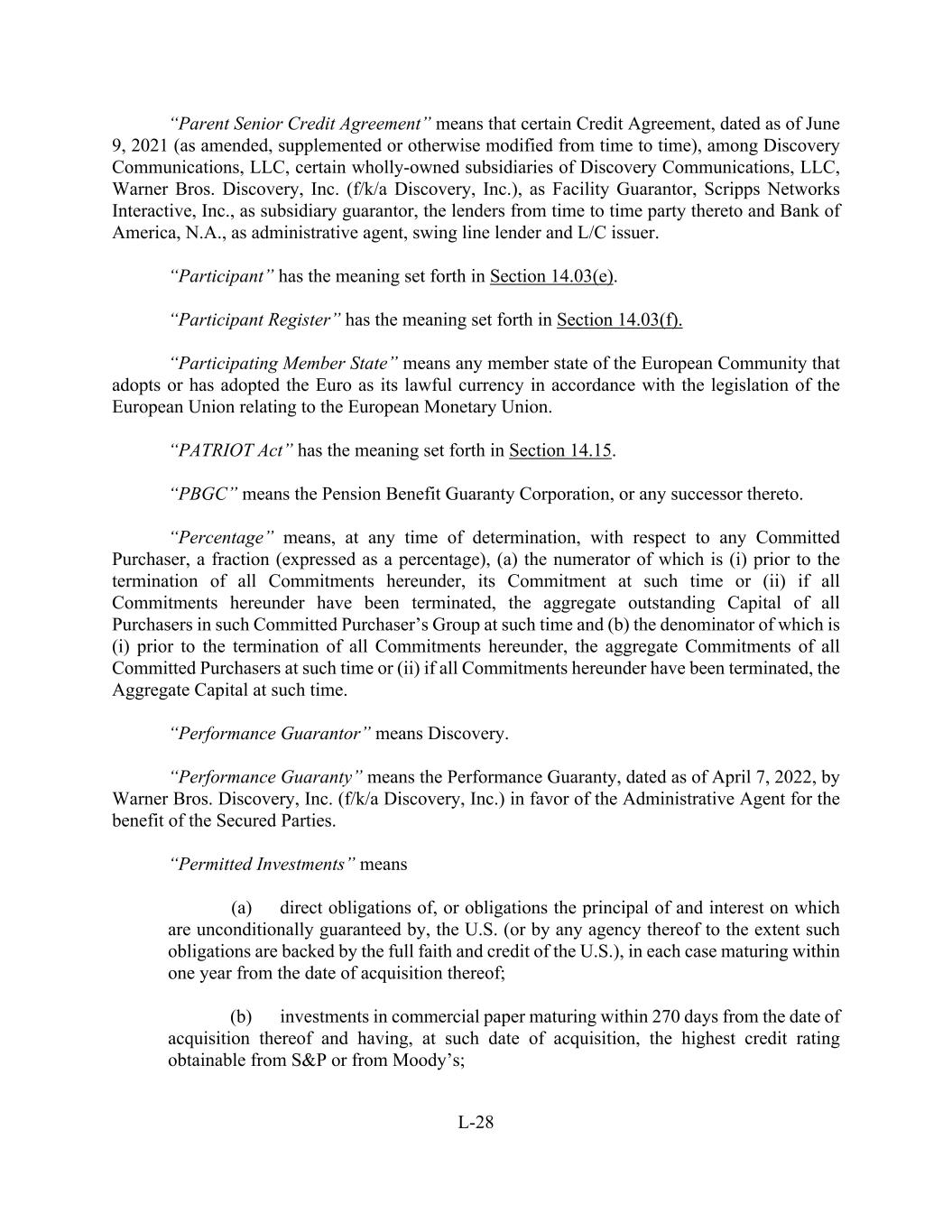 L-28 “Parent Senior Credit Agreement” means that certain Credit Agreement, dated as of June 9, 2021 (as amended, supplemented or otherwise modified from time to time), among Discovery Communications, LLC, certain wholly-owned subsidiaries of Discovery Communications, LLC, Warner Bros. Discovery, Inc. (f/k/a Discovery, Inc.), as Facility Guarantor, Scripps Networks Interactive, Inc., as subsidiary guarantor, the lenders from time to time party thereto and Bank of America, N.A., as administrative agent, swing line lender and L/C issuer. “Participant” has the meaning set forth in Section 14.03(e). “Participant Register” has the meaning set forth in Section 14.03(f). “Participating Member State” means any member state of the European Community that adopts or has adopted the Euro as its lawful currency in accordance with the legislation of the European Union relating to the European Monetary Union. “PATRIOT Act” has the meaning set forth in Section 14.15. “PBGC” means the Pension Benefit Guaranty Corporation, or any successor thereto. “Percentage” means, at any time of determination, with respect to any Committed Purchaser, a fraction (expressed as a percentage), (a) the numerator of which is (i) prior to the termination of all Commitments hereunder, its Commitment at such time or (ii) if all Commitments hereunder have been terminated, the aggregate outstanding Capital of all Purchasers in such Committed Purchaser’s Group at such time and (b) the denominator of which is (i) prior to the termination of all Commitments hereunder, the aggregate Commitments of all Committed Purchasers at such time or (ii) if all Commitments hereunder have been terminated, the Aggregate Capital at such time. “Performance Guarantor” means Discovery. “Performance Guaranty” means the Performance Guaranty, dated as of April 7, 2022, by Warner Bros. Discovery, Inc. (f/k/a Discovery, Inc.) in favor of the Administrative Agent for the benefit of the Secured Parties. “Permitted Investments” means (a) direct obligations of, or obligations the principal of and interest on which are unconditionally guaranteed by, the U.S. (or by any agency thereof to the extent such obligations are backed by the full faith and credit of the U.S.), in each case maturing within one year from the date of acquisition thereof; (b) investments in commercial paper maturing within 270 days from the date of acquisition thereof and having, at such date of acquisition, the highest credit rating obtainable from S&P or from Moody’s;