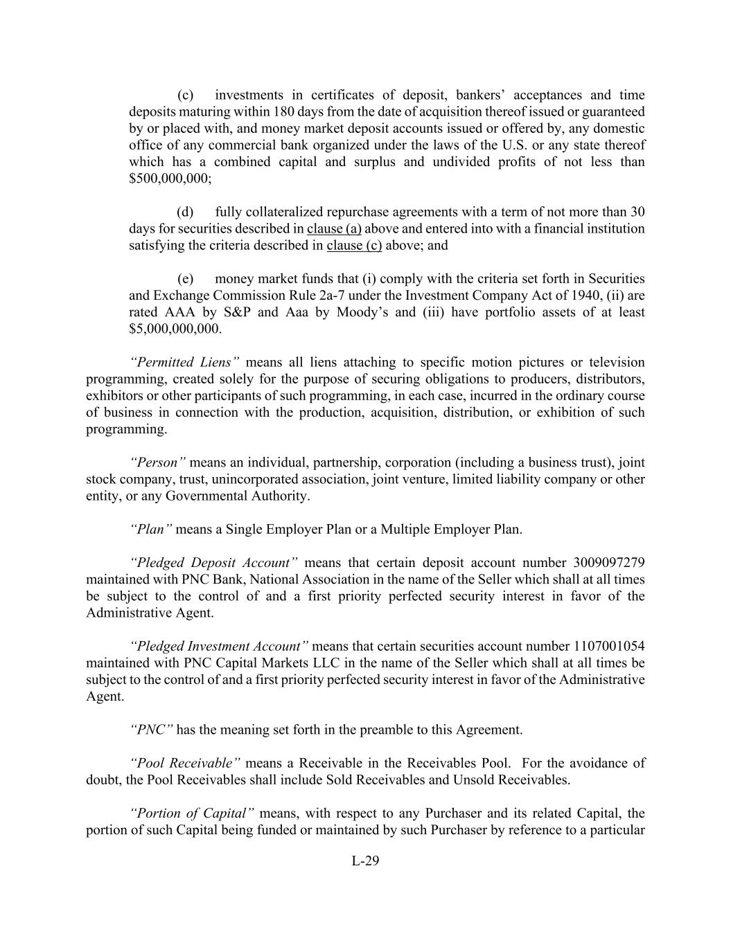 L-29 (c) investments in certificates of deposit, bankers’ acceptances and time deposits maturing within 180 days from the date of acquisition thereof issued or guaranteed by or placed with, and money market deposit accounts issued or offered by, any domestic office of any commercial bank organized under the laws of the U.S. or any state thereof which has a combined capital and surplus and undivided profits of not less than $500,000,000; (d) fully collateralized repurchase agreements with a term of not more than 30 days for securities described in clause (a) above and entered into with a financial institution satisfying the criteria described in clause (c) above; and (e) money market funds that (i) comply with the criteria set forth in Securities and Exchange Commission Rule 2a-7 under the Investment Company Act of 1940, (ii) are rated AAA by S&P and Aaa by Moody’s and (iii) have portfolio assets of at least $5,000,000,000. “Permitted Liens” means all liens attaching to specific motion pictures or television programming, created solely for the purpose of securing obligations to producers, distributors, exhibitors or other participants of such programming, in each case, incurred in the ordinary course of business in connection with the production, acquisition, distribution, or exhibition of such programming. “Person” means an individual, partnership, corporation (including a business trust), joint stock company, trust, unincorporated association, joint venture, limited liability company or other entity, or any Governmental Authority. “Plan” means a Single Employer Plan or a Multiple Employer Plan. “Pledged Deposit Account” means that certain deposit account number 3009097279 maintained with PNC Bank, National Association in the name of the Seller which shall at all times be subject to the control of and a first priority perfected security interest in favor of the Administrative Agent. “Pledged Investment Account” means that certain securities account number 1107001054 maintained with PNC Capital Markets LLC in the name of the Seller which shall at all times be subject to the control of and a first priority perfected security interest in favor of the Administrative Agent. “PNC” has the meaning set forth in the preamble to this Agreement. “Pool Receivable” means a Receivable in the Receivables Pool. For the avoidance of doubt, the Pool Receivables shall include Sold Receivables and Unsold Receivables. “Portion of Capital” means, with respect to any Purchaser and its related Capital, the portion of such Capital being funded or maintained by such Purchaser by reference to a particular