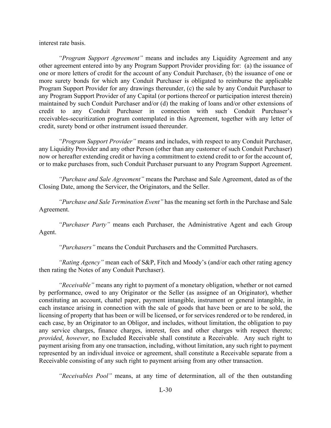L-30 interest rate basis. “Program Support Agreement” means and includes any Liquidity Agreement and any other agreement entered into by any Program Support Provider providing for: (a) the issuance of one or more letters of credit for the account of any Conduit Purchaser, (b) the issuance of one or more surety bonds for which any Conduit Purchaser is obligated to reimburse the applicable Program Support Provider for any drawings thereunder, (c) the sale by any Conduit Purchaser to any Program Support Provider of any Capital (or portions thereof or participation interest therein) maintained by such Conduit Purchaser and/or (d) the making of loans and/or other extensions of credit to any Conduit Purchaser in connection with such Conduit Purchaser’s receivables-securitization program contemplated in this Agreement, together with any letter of credit, surety bond or other instrument issued thereunder. “Program Support Provider” means and includes, with respect to any Conduit Purchaser, any Liquidity Provider and any other Person (other than any customer of such Conduit Purchaser) now or hereafter extending credit or having a commitment to extend credit to or for the account of, or to make purchases from, such Conduit Purchaser pursuant to any Program Support Agreement. “Purchase and Sale Agreement” means the Purchase and Sale Agreement, dated as of the Closing Date, among the Servicer, the Originators, and the Seller. “Purchase and Sale Termination Event” has the meaning set forth in the Purchase and Sale Agreement. “Purchaser Party” means each Purchaser, the Administrative Agent and each Group Agent. “Purchasers” means the Conduit Purchasers and the Committed Purchasers. “Rating Agency” mean each of S&P, Fitch and Moody’s (and/or each other rating agency then rating the Notes of any Conduit Purchaser). “Receivable” means any right to payment of a monetary obligation, whether or not earned by performance, owed to any Originator or the Seller (as assignee of an Originator), whether constituting an account, chattel paper, payment intangible, instrument or general intangible, in each instance arising in connection with the sale of goods that have been or are to be sold, the licensing of property that has been or will be licensed, or for services rendered or to be rendered, in each case, by an Originator to an Obligor, and includes, without limitation, the obligation to pay any service charges, finance charges, interest, fees and other charges with respect thereto; provided, however, no Excluded Receivable shall constitute a Receivable. Any such right to payment arising from any one transaction, including, without limitation, any such right to payment represented by an individual invoice or agreement, shall constitute a Receivable separate from a Receivable consisting of any such right to payment arising from any other transaction. “Receivables Pool” means, at any time of determination, all of the then outstanding