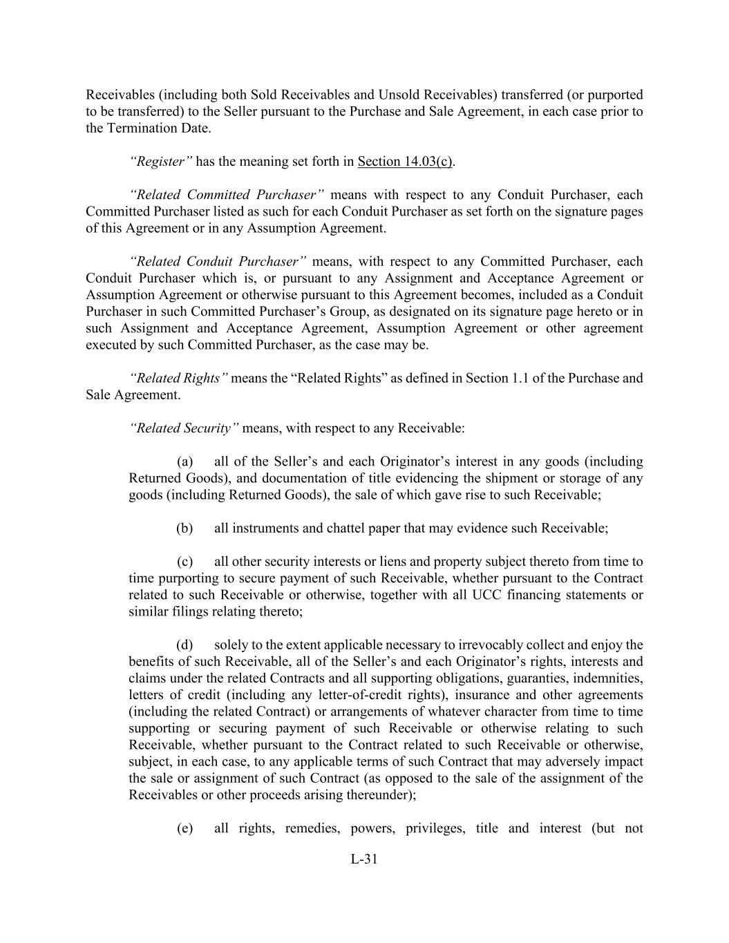 L-31 Receivables (including both Sold Receivables and Unsold Receivables) transferred (or purported to be transferred) to the Seller pursuant to the Purchase and Sale Agreement, in each case prior to the Termination Date. “Register” has the meaning set forth in Section 14.03(c). “Related Committed Purchaser” means with respect to any Conduit Purchaser, each Committed Purchaser listed as such for each Conduit Purchaser as set forth on the signature pages of this Agreement or in any Assumption Agreement. “Related Conduit Purchaser” means, with respect to any Committed Purchaser, each Conduit Purchaser which is, or pursuant to any Assignment and Acceptance Agreement or Assumption Agreement or otherwise pursuant to this Agreement becomes, included as a Conduit Purchaser in such Committed Purchaser’s Group, as designated on its signature page hereto or in such Assignment and Acceptance Agreement, Assumption Agreement or other agreement executed by such Committed Purchaser, as the case may be. “Related Rights” means the “Related Rights” as defined in Section 1.1 of the Purchase and Sale Agreement. “Related Security” means, with respect to any Receivable: (a) all of the Seller’s and each Originator’s interest in any goods (including Returned Goods), and documentation of title evidencing the shipment or storage of any goods (including Returned Goods), the sale of which gave rise to such Receivable; (b) all instruments and chattel paper that may evidence such Receivable; (c) all other security interests or liens and property subject thereto from time to time purporting to secure payment of such Receivable, whether pursuant to the Contract related to such Receivable or otherwise, together with all UCC financing statements or similar filings relating thereto; (d) solely to the extent applicable necessary to irrevocably collect and enjoy the benefits of such Receivable, all of the Seller’s and each Originator’s rights, interests and claims under the related Contracts and all supporting obligations, guaranties, indemnities, letters of credit (including any letter-of-credit rights), insurance and other agreements (including the related Contract) or arrangements of whatever character from time to time supporting or securing payment of such Receivable or otherwise relating to such Receivable, whether pursuant to the Contract related to such Receivable or otherwise, subject, in each case, to any applicable terms of such Contract that may adversely impact the sale or assignment of such Contract (as opposed to the sale of the assignment of the Receivables or other proceeds arising thereunder); (e) all rights, remedies, powers, privileges, title and interest (but not