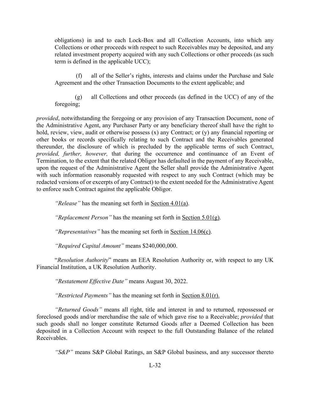 L-32 obligations) in and to each Lock-Box and all Collection Accounts, into which any Collections or other proceeds with respect to such Receivables may be deposited, and any related investment property acquired with any such Collections or other proceeds (as such term is defined in the applicable UCC); (f) all of the Seller’s rights, interests and claims under the Purchase and Sale Agreement and the other Transaction Documents to the extent applicable; and (g) all Collections and other proceeds (as defined in the UCC) of any of the foregoing; provided, notwithstanding the foregoing or any provision of any Transaction Document, none of the Administrative Agent, any Purchaser Party or any beneficiary thereof shall have the right to hold, review, view, audit or otherwise possess (x) any Contract; or (y) any financial reporting or other books or records specifically relating to such Contract and the Receivables generated thereunder, the disclosure of which is precluded by the applicable terms of such Contract, provided, further, however, that during the occurrence and continuance of an Event of Termination, to the extent that the related Obligor has defaulted in the payment of any Receivable, upon the request of the Administrative Agent the Seller shall provide the Administrative Agent with such information reasonably requested with respect to any such Contract (which may be redacted versions of or excerpts of any Contract) to the extent needed for the Administrative Agent to enforce such Contract against the applicable Obligor. “Release” has the meaning set forth in Section 4.01(a). “Replacement Person” has the meaning set forth in Section 5.01(g). “Representatives” has the meaning set forth in Section 14.06(c). “Required Capital Amount” means $240,000,000. “Resolution Authority” means an EEA Resolution Authority or, with respect to any UK Financial Institution, a UK Resolution Authority. “Restatement Effective Date” means August 30, 2022. “Restricted Payments” has the meaning set forth in Section 8.01(r). “Returned Goods” means all right, title and interest in and to returned, repossessed or foreclosed goods and/or merchandise the sale of which gave rise to a Receivable; provided that such goods shall no longer constitute Returned Goods after a Deemed Collection has been deposited in a Collection Account with respect to the full Outstanding Balance of the related Receivables. “S&P” means S&P Global Ratings, an S&P Global business, and any successor thereto