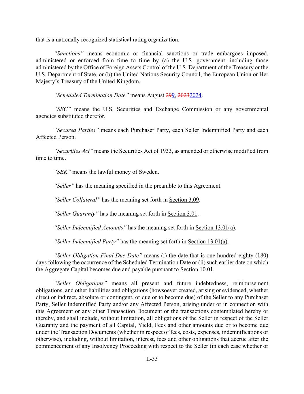 L-33 that is a nationally recognized statistical rating organization. “Sanctions” means economic or financial sanctions or trade embargoes imposed, administered or enforced from time to time by (a) the U.S. government, including those administered by the Office of Foreign Assets Control of the U.S. Department of the Treasury or the U.S. Department of State, or (b) the United Nations Security Council, the European Union or Her Majesty’s Treasury of the United Kingdom. “Scheduled Termination Date” means August 299, 20232024. “SEC” means the U.S. Securities and Exchange Commission or any governmental agencies substituted therefor. “Secured Parties” means each Purchaser Party, each Seller Indemnified Party and each Affected Person. “Securities Act” means the Securities Act of 1933, as amended or otherwise modified from time to time. “SEK” means the lawful money of Sweden. “Seller” has the meaning specified in the preamble to this Agreement. “Seller Collateral” has the meaning set forth in Section 3.09. “Seller Guaranty” has the meaning set forth in Section 3.01. “Seller Indemnified Amounts” has the meaning set forth in Section 13.01(a). “Seller Indemnified Party” has the meaning set forth in Section 13.01(a). “Seller Obligation Final Due Date” means (i) the date that is one hundred eighty (180) days following the occurrence of the Scheduled Termination Date or (ii) such earlier date on which the Aggregate Capital becomes due and payable pursuant to Section 10.01. “Seller Obligations” means all present and future indebtedness, reimbursement obligations, and other liabilities and obligations (howsoever created, arising or evidenced, whether direct or indirect, absolute or contingent, or due or to become due) of the Seller to any Purchaser Party, Seller Indemnified Party and/or any Affected Person, arising under or in connection with this Agreement or any other Transaction Document or the transactions contemplated hereby or thereby, and shall include, without limitation, all obligations of the Seller in respect of the Seller Guaranty and the payment of all Capital, Yield, Fees and other amounts due or to become due under the Transaction Documents (whether in respect of fees, costs, expenses, indemnifications or otherwise), including, without limitation, interest, fees and other obligations that accrue after the commencement of any Insolvency Proceeding with respect to the Seller (in each case whether or