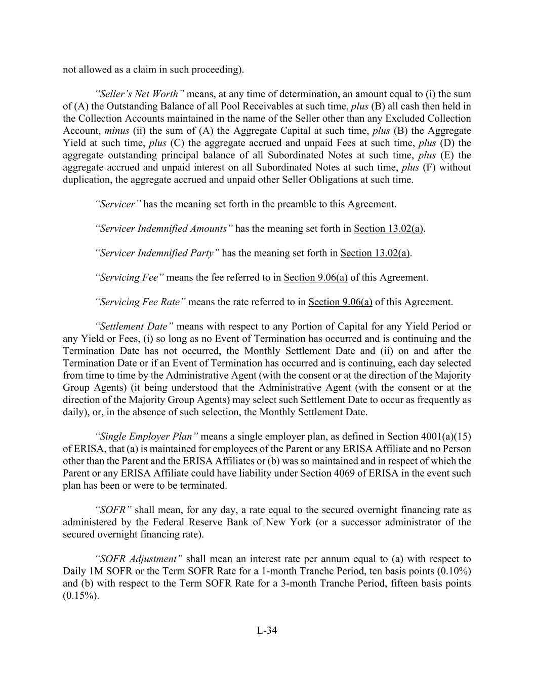 L-34 not allowed as a claim in such proceeding). “Seller’s Net Worth” means, at any time of determination, an amount equal to (i) the sum of (A) the Outstanding Balance of all Pool Receivables at such time, plus (B) all cash then held in the Collection Accounts maintained in the name of the Seller other than any Excluded Collection Account, minus (ii) the sum of (A) the Aggregate Capital at such time, plus (B) the Aggregate Yield at such time, plus (C) the aggregate accrued and unpaid Fees at such time, plus (D) the aggregate outstanding principal balance of all Subordinated Notes at such time, plus (E) the aggregate accrued and unpaid interest on all Subordinated Notes at such time, plus (F) without duplication, the aggregate accrued and unpaid other Seller Obligations at such time. “Servicer” has the meaning set forth in the preamble to this Agreement. “Servicer Indemnified Amounts” has the meaning set forth in Section 13.02(a). “Servicer Indemnified Party” has the meaning set forth in Section 13.02(a). “Servicing Fee” means the fee referred to in Section 9.06(a) of this Agreement. “Servicing Fee Rate” means the rate referred to in Section 9.06(a) of this Agreement. “Settlement Date” means with respect to any Portion of Capital for any Yield Period or any Yield or Fees, (i) so long as no Event of Termination has occurred and is continuing and the Termination Date has not occurred, the Monthly Settlement Date and (ii) on and after the Termination Date or if an Event of Termination has occurred and is continuing, each day selected from time to time by the Administrative Agent (with the consent or at the direction of the Majority Group Agents) (it being understood that the Administrative Agent (with the consent or at the direction of the Majority Group Agents) may select such Settlement Date to occur as frequently as daily), or, in the absence of such selection, the Monthly Settlement Date. “Single Employer Plan” means a single employer plan, as defined in Section 4001(a)(15) of ERISA, that (a) is maintained for employees of the Parent or any ERISA Affiliate and no Person other than the Parent and the ERISA Affiliates or (b) was so maintained and in respect of which the Parent or any ERISA Affiliate could have liability under Section 4069 of ERISA in the event such plan has been or were to be terminated. “SOFR” shall mean, for any day, a rate equal to the secured overnight financing rate as administered by the Federal Reserve Bank of New York (or a successor administrator of the secured overnight financing rate). “SOFR Adjustment” shall mean an interest rate per annum equal to (a) with respect to Daily 1M SOFR or the Term SOFR Rate for a 1-month Tranche Period, ten basis points (0.10%) and (b) with respect to the Term SOFR Rate for a 3-month Tranche Period, fifteen basis points (0.15%).