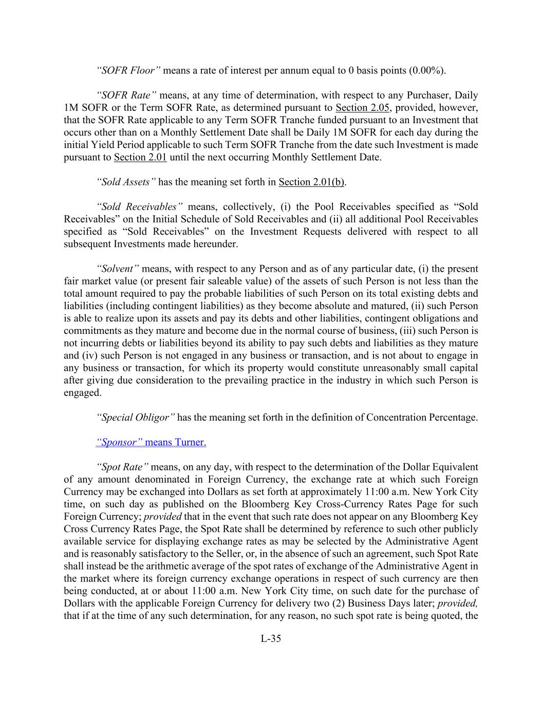 L-35 “SOFR Floor” means a rate of interest per annum equal to 0 basis points (0.00%). “SOFR Rate” means, at any time of determination, with respect to any Purchaser, Daily 1M SOFR or the Term SOFR Rate, as determined pursuant to Section 2.05, provided, however, that the SOFR Rate applicable to any Term SOFR Tranche funded pursuant to an Investment that occurs other than on a Monthly Settlement Date shall be Daily 1M SOFR for each day during the initial Yield Period applicable to such Term SOFR Tranche from the date such Investment is made pursuant to Section 2.01 until the next occurring Monthly Settlement Date. “Sold Assets” has the meaning set forth in Section 2.01(b). “Sold Receivables” means, collectively, (i) the Pool Receivables specified as “Sold Receivables” on the Initial Schedule of Sold Receivables and (ii) all additional Pool Receivables specified as “Sold Receivables” on the Investment Requests delivered with respect to all subsequent Investments made hereunder. “Solvent” means, with respect to any Person and as of any particular date, (i) the present fair market value (or present fair saleable value) of the assets of such Person is not less than the total amount required to pay the probable liabilities of such Person on its total existing debts and liabilities (including contingent liabilities) as they become absolute and matured, (ii) such Person is able to realize upon its assets and pay its debts and other liabilities, contingent obligations and commitments as they mature and become due in the normal course of business, (iii) such Person is not incurring debts or liabilities beyond its ability to pay such debts and liabilities as they mature and (iv) such Person is not engaged in any business or transaction, and is not about to engage in any business or transaction, for which its property would constitute unreasonably small capital after giving due consideration to the prevailing practice in the industry in which such Person is engaged. “Special Obligor” has the meaning set forth in the definition of Concentration Percentage. “Sponsor” means Turner. “Spot Rate” means, on any day, with respect to the determination of the Dollar Equivalent of any amount denominated in Foreign Currency, the exchange rate at which such Foreign Currency may be exchanged into Dollars as set forth at approximately 11:00 a.m. New York City time, on such day as published on the Bloomberg Key Cross-Currency Rates Page for such Foreign Currency; provided that in the event that such rate does not appear on any Bloomberg Key Cross Currency Rates Page, the Spot Rate shall be determined by reference to such other publicly available service for displaying exchange rates as may be selected by the Administrative Agent and is reasonably satisfactory to the Seller, or, in the absence of such an agreement, such Spot Rate shall instead be the arithmetic average of the spot rates of exchange of the Administrative Agent in the market where its foreign currency exchange operations in respect of such currency are then being conducted, at or about 11:00 a.m. New York City time, on such date for the purchase of Dollars with the applicable Foreign Currency for delivery two (2) Business Days later; provided, that if at the time of any such determination, for any reason, no such spot rate is being quoted, the