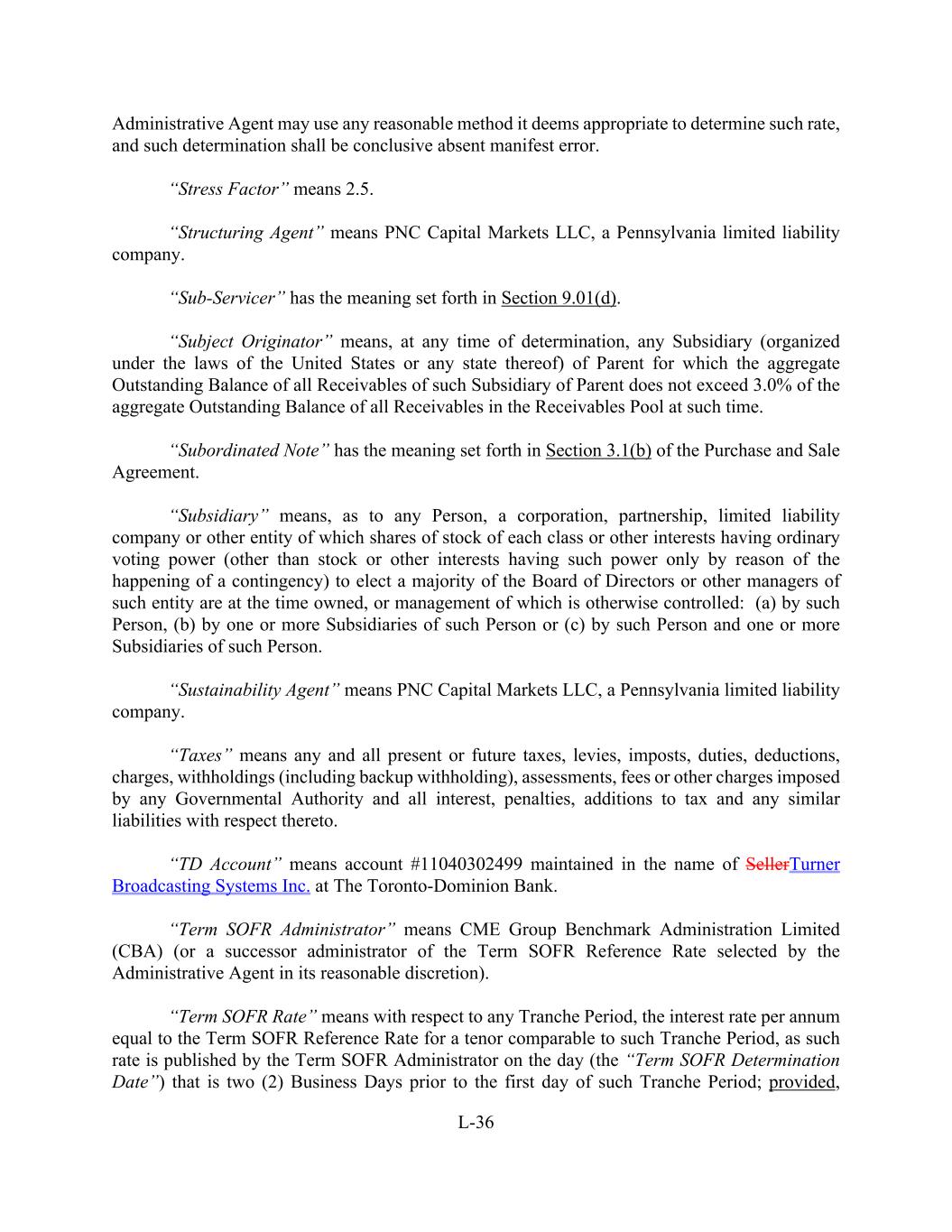 L-36 Administrative Agent may use any reasonable method it deems appropriate to determine such rate, and such determination shall be conclusive absent manifest error. “Stress Factor” means 2.5. “Structuring Agent” means PNC Capital Markets LLC, a Pennsylvania limited liability company. “Sub-Servicer” has the meaning set forth in Section 9.01(d). “Subject Originator” means, at any time of determination, any Subsidiary (organized under the laws of the United States or any state thereof) of Parent for which the aggregate Outstanding Balance of all Receivables of such Subsidiary of Parent does not exceed 3.0% of the aggregate Outstanding Balance of all Receivables in the Receivables Pool at such time. “Subordinated Note” has the meaning set forth in Section 3.1(b) of the Purchase and Sale Agreement. “Subsidiary” means, as to any Person, a corporation, partnership, limited liability company or other entity of which shares of stock of each class or other interests having ordinary voting power (other than stock or other interests having such power only by reason of the happening of a contingency) to elect a majority of the Board of Directors or other managers of such entity are at the time owned, or management of which is otherwise controlled: (a) by such Person, (b) by one or more Subsidiaries of such Person or (c) by such Person and one or more Subsidiaries of such Person. “Sustainability Agent” means PNC Capital Markets LLC, a Pennsylvania limited liability company. “Taxes” means any and all present or future taxes, levies, imposts, duties, deductions, charges, withholdings (including backup withholding), assessments, fees or other charges imposed by any Governmental Authority and all interest, penalties, additions to tax and any similar liabilities with respect thereto. “TD Account” means account #11040302499 maintained in the name of SellerTurner Broadcasting Systems Inc. at The Toronto-Dominion Bank. “Term SOFR Administrator” means CME Group Benchmark Administration Limited (CBA) (or a successor administrator of the Term SOFR Reference Rate selected by the Administrative Agent in its reasonable discretion). “Term SOFR Rate” means with respect to any Tranche Period, the interest rate per annum equal to the Term SOFR Reference Rate for a tenor comparable to such Tranche Period, as such rate is published by the Term SOFR Administrator on the day (the “Term SOFR Determination Date”) that is two (2) Business Days prior to the first day of such Tranche Period; provided,