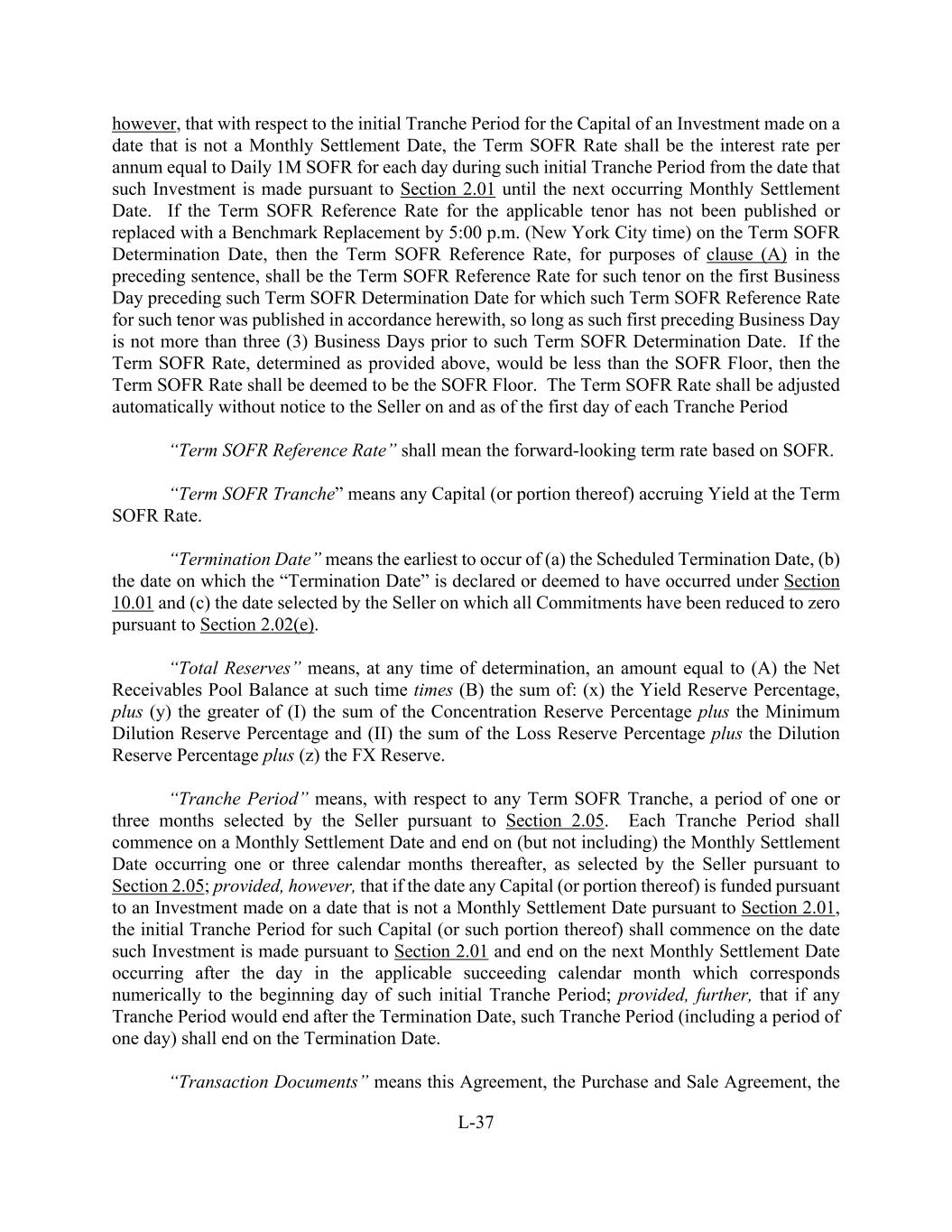 L-37 however, that with respect to the initial Tranche Period for the Capital of an Investment made on a date that is not a Monthly Settlement Date, the Term SOFR Rate shall be the interest rate per annum equal to Daily 1M SOFR for each day during such initial Tranche Period from the date that such Investment is made pursuant to Section 2.01 until the next occurring Monthly Settlement Date. If the Term SOFR Reference Rate for the applicable tenor has not been published or replaced with a Benchmark Replacement by 5:00 p.m. (New York City time) on the Term SOFR Determination Date, then the Term SOFR Reference Rate, for purposes of clause (A) in the preceding sentence, shall be the Term SOFR Reference Rate for such tenor on the first Business Day preceding such Term SOFR Determination Date for which such Term SOFR Reference Rate for such tenor was published in accordance herewith, so long as such first preceding Business Day is not more than three (3) Business Days prior to such Term SOFR Determination Date. If the Term SOFR Rate, determined as provided above, would be less than the SOFR Floor, then the Term SOFR Rate shall be deemed to be the SOFR Floor. The Term SOFR Rate shall be adjusted automatically without notice to the Seller on and as of the first day of each Tranche Period “Term SOFR Reference Rate” shall mean the forward-looking term rate based on SOFR. “Term SOFR Tranche” means any Capital (or portion thereof) accruing Yield at the Term SOFR Rate. “Termination Date” means the earliest to occur of (a) the Scheduled Termination Date, (b) the date on which the “Termination Date” is declared or deemed to have occurred under Section 10.01 and (c) the date selected by the Seller on which all Commitments have been reduced to zero pursuant to Section 2.02(e). “Total Reserves” means, at any time of determination, an amount equal to (A) the Net Receivables Pool Balance at such time times (B) the sum of: (x) the Yield Reserve Percentage, plus (y) the greater of (I) the sum of the Concentration Reserve Percentage plus the Minimum Dilution Reserve Percentage and (II) the sum of the Loss Reserve Percentage plus the Dilution Reserve Percentage plus (z) the FX Reserve. “Tranche Period” means, with respect to any Term SOFR Tranche, a period of one or three months selected by the Seller pursuant to Section 2.05. Each Tranche Period shall commence on a Monthly Settlement Date and end on (but not including) the Monthly Settlement Date occurring one or three calendar months thereafter, as selected by the Seller pursuant to Section 2.05; provided, however, that if the date any Capital (or portion thereof) is funded pursuant to an Investment made on a date that is not a Monthly Settlement Date pursuant to Section 2.01, the initial Tranche Period for such Capital (or such portion thereof) shall commence on the date such Investment is made pursuant to Section 2.01 and end on the next Monthly Settlement Date occurring after the day in the applicable succeeding calendar month which corresponds numerically to the beginning day of such initial Tranche Period; provided, further, that if any Tranche Period would end after the Termination Date, such Tranche Period (including a period of one day) shall end on the Termination Date. “Transaction Documents” means this Agreement, the Purchase and Sale Agreement, the