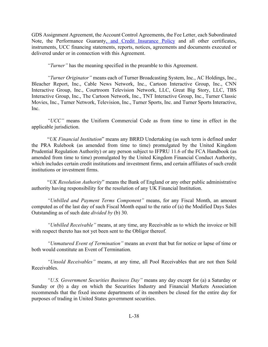L-38 GDS Assignment Agreement, the Account Control Agreements, the Fee Letter, each Subordinated Note, the Performance Guaranty, and Credit Insurance Policy and all other certificates, instruments, UCC financing statements, reports, notices, agreements and documents executed or delivered under or in connection with this Agreement. “Turner” has the meaning specified in the preamble to this Agreement. “Turner Originator” means each of Turner Broadcasting System, Inc., AC Holdings, Inc., Bleacher Report, Inc., Cable News Network, Inc., Cartoon Interactive Group, Inc., CNN Interactive Group, Inc., Courtroom Television Network, LLC, Great Big Story, LLC, TBS Interactive Group, Inc., The Cartoon Network, Inc., TNT Interactive Group, Inc., Turner Classic Movies, Inc., Turner Network, Television, Inc., Turner Sports, Inc. and Turner Sports Interactive, Inc. “UCC” means the Uniform Commercial Code as from time to time in effect in the applicable jurisdiction. “UK Financial Institution” means any BRRD Undertaking (as such term is defined under the PRA Rulebook (as amended from time to time) promulgated by the United Kingdom Prudential Regulation Authority) or any person subject to IFPRU 11.6 of the FCA Handbook (as amended from time to time) promulgated by the United Kingdom Financial Conduct Authority, which includes certain credit institutions and investment firms, and certain affiliates of such credit institutions or investment firms. “UK Resolution Authority” means the Bank of England or any other public administrative authority having responsibility for the resolution of any UK Financial Institution. “Unbilled and Payment Terms Component” means, for any Fiscal Month, an amount computed as of the last day of such Fiscal Month equal to the ratio of (a) the Modified Days Sales Outstanding as of such date divided by (b) 30. “Unbilled Receivable” means, at any time, any Receivable as to which the invoice or bill with respect thereto has not yet been sent to the Obligor thereof. “Unmatured Event of Termination” means an event that but for notice or lapse of time or both would constitute an Event of Termination. “Unsold Receivables” means, at any time, all Pool Receivables that are not then Sold Receivables. “U.S. Government Securities Business Day” means any day except for (a) a Saturday or Sunday or (b) a day on which the Securities Industry and Financial Markets Association recommends that the fixed income departments of its members be closed for the entire day for purposes of trading in United States government securities.