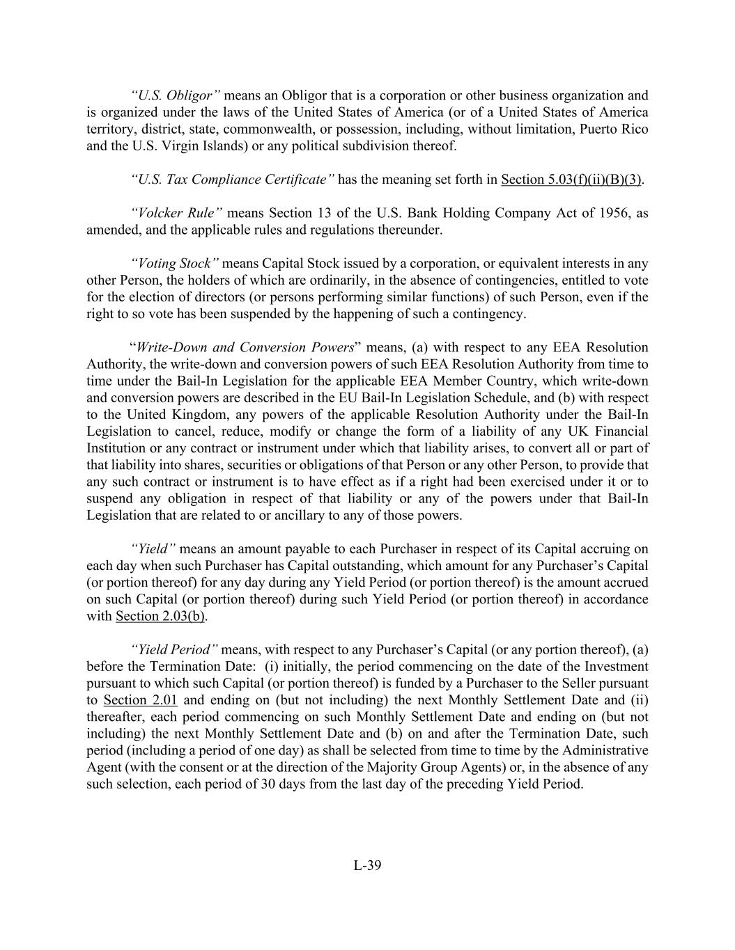 L-39 “U.S. Obligor” means an Obligor that is a corporation or other business organization and is organized under the laws of the United States of America (or of a United States of America territory, district, state, commonwealth, or possession, including, without limitation, Puerto Rico and the U.S. Virgin Islands) or any political subdivision thereof. “U.S. Tax Compliance Certificate” has the meaning set forth in Section 5.03(f)(ii)(B)(3). “Volcker Rule” means Section 13 of the U.S. Bank Holding Company Act of 1956, as amended, and the applicable rules and regulations thereunder. “Voting Stock” means Capital Stock issued by a corporation, or equivalent interests in any other Person, the holders of which are ordinarily, in the absence of contingencies, entitled to vote for the election of directors (or persons performing similar functions) of such Person, even if the right to so vote has been suspended by the happening of such a contingency. “Write-Down and Conversion Powers” means, (a) with respect to any EEA Resolution Authority, the write-down and conversion powers of such EEA Resolution Authority from time to time under the Bail-In Legislation for the applicable EEA Member Country, which write-down and conversion powers are described in the EU Bail-In Legislation Schedule, and (b) with respect to the United Kingdom, any powers of the applicable Resolution Authority under the Bail-In Legislation to cancel, reduce, modify or change the form of a liability of any UK Financial Institution or any contract or instrument under which that liability arises, to convert all or part of that liability into shares, securities or obligations of that Person or any other Person, to provide that any such contract or instrument is to have effect as if a right had been exercised under it or to suspend any obligation in respect of that liability or any of the powers under that Bail-In Legislation that are related to or ancillary to any of those powers. “Yield” means an amount payable to each Purchaser in respect of its Capital accruing on each day when such Purchaser has Capital outstanding, which amount for any Purchaser’s Capital (or portion thereof) for any day during any Yield Period (or portion thereof) is the amount accrued on such Capital (or portion thereof) during such Yield Period (or portion thereof) in accordance with Section 2.03(b). “Yield Period” means, with respect to any Purchaser’s Capital (or any portion thereof), (a) before the Termination Date: (i) initially, the period commencing on the date of the Investment pursuant to which such Capital (or portion thereof) is funded by a Purchaser to the Seller pursuant to Section 2.01 and ending on (but not including) the next Monthly Settlement Date and (ii) thereafter, each period commencing on such Monthly Settlement Date and ending on (but not including) the next Monthly Settlement Date and (b) on and after the Termination Date, such period (including a period of one day) as shall be selected from time to time by the Administrative Agent (with the consent or at the direction of the Majority Group Agents) or, in the absence of any such selection, each period of 30 days from the last day of the preceding Yield Period.
