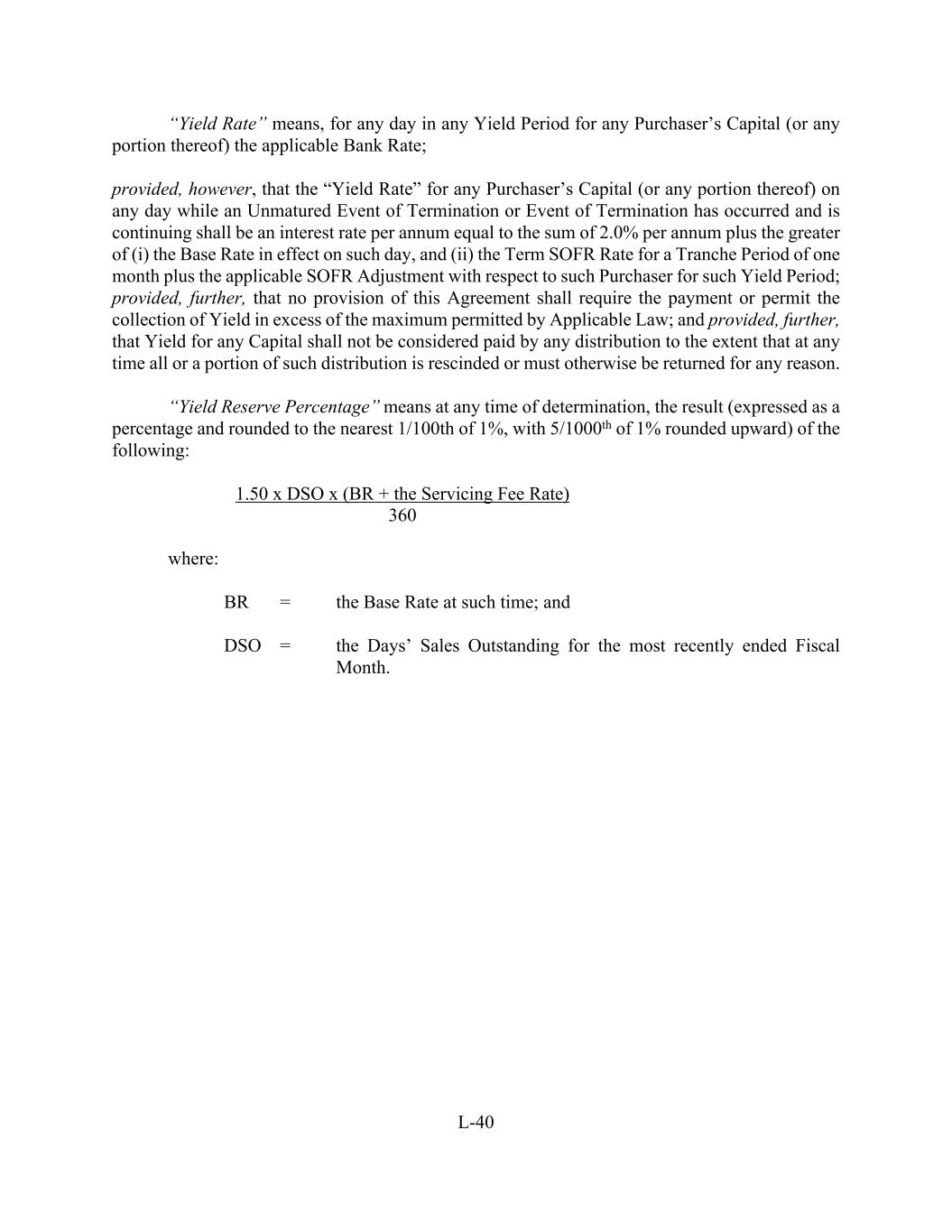 L-40 “Yield Rate” means, for any day in any Yield Period for any Purchaser’s Capital (or any portion thereof) the applicable Bank Rate; provided, however, that the “Yield Rate” for any Purchaser’s Capital (or any portion thereof) on any day while an Unmatured Event of Termination or Event of Termination has occurred and is continuing shall be an interest rate per annum equal to the sum of 2.0% per annum plus the greater of (i) the Base Rate in effect on such day, and (ii) the Term SOFR Rate for a Tranche Period of one month plus the applicable SOFR Adjustment with respect to such Purchaser for such Yield Period; provided, further, that no provision of this Agreement shall require the payment or permit the collection of Yield in excess of the maximum permitted by Applicable Law; and provided, further, that Yield for any Capital shall not be considered paid by any distribution to the extent that at any time all or a portion of such distribution is rescinded or must otherwise be returned for any reason. “Yield Reserve Percentage” means at any time of determination, the result (expressed as a percentage and rounded to the nearest 1/100th of 1%, with 5/1000th of 1% rounded upward) of the following: 1.50 x DSO x (BR + the Servicing Fee Rate) 360 where: BR = the Base Rate at such time; and DSO = the Days’ Sales Outstanding for the most recently ended Fiscal Month.
