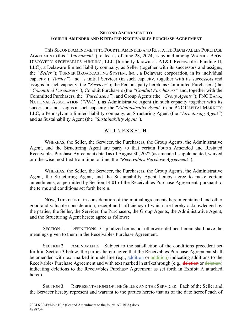 2024.6.30-Exhibit 10.2 (Second Amendment to the fourth AR RPA).docx 4288734 SECOND AMENDMENT TO FOURTH AMENDED AND RESTATED RECEIVABLES PURCHASE AGREEMENT This SECOND AMENDMENT TO FOURTH AMENDED AND RESTATED RECEIVABLES PURCHASE AGREEMENT (this “Amendment”), dated as of June 28, 2024, is by and among WARNER BROS. DISCOVERY RECEIVABLES FUNDING, LLC (formerly known as AT&T Receivables Funding II, LLC), a Delaware limited liability company, as Seller (together with its successors and assigns, the “Seller”); TURNER BROADCASTING SYSTEM, INC., a Delaware corporation, in its individual capacity (“Turner”) and as initial Servicer (in such capacity, together with its successors and assigns in such capacity, the “Servicer”); the Persons party hereto as Committed Purchasers (the “Committed Purchasers”), Conduit Purchasers (the “Conduit Purchasers” and, together with the Committed Purchasers, the “Purchasers”), and Group Agents (the “Group Agents”); PNC BANK, NATIONAL ASSOCIATION (“PNC”), as Administrative Agent (in such capacity together with its successors and assigns in such capacity, the “Administrative Agent”); and PNC CAPITAL MARKETS LLC, a Pennsylvania limited liability company, as Structuring Agent (the “Structuring Agent”) and as Sustainability Agent (the “Sustainability Agent”). W I T N E S S E T H: WHEREAS, the Seller, the Servicer, the Purchasers, the Group Agents, the Administrative Agent, and the Structuring Agent are party to that certain Fourth Amended and Restated Receivables Purchase Agreement dated as of August 30, 2022 (as amended, supplemented, waived or otherwise modified from time to time, the “Receivables Purchase Agreement”). WHEREAS, the Seller, the Servicer, the Purchasers, the Group Agents, the Administrative Agent, the Structuring Agent, and the Sustainability Agent hereby agree to make certain amendments, as permitted by Section 14.01 of the Receivables Purchase Agreement, pursuant to the terms and conditions set forth herein. NOW, THEREFORE, in consideration of the mutual agreements herein contained and other good and valuable consideration, receipt and sufficiency of which are hereby acknowledged by the parties, the Seller, the Servicer, the Purchasers, the Group Agents, the Administrative Agent, and the Structuring Agent hereto agree as follows: SECTION 1. DEFINITIONS. Capitalized terms not otherwise defined herein shall have the meanings given to them in the Receivables Purchase Agreement. SECTION 2. AMENDMENTS. Subject to the satisfaction of the conditions precedent set forth in Section 3 below, the parties hereto agree that the Receivables Purchase Agreement shall be amended with text marked in underline (e.g., addition or addition) indicating additions to the Receivables Purchase Agreement and with text marked in strikethrough (e.g., deletion or deletion) indicating deletions to the Receivables Purchase Agreement as set forth in Exhibit A attached hereto. SECTION 3. REPRESENTATIONS OF THE SELLER AND THE SERVICER. Each of the Seller and the Servicer hereby represent and warrant to the parties hereto that as of the date hereof each of