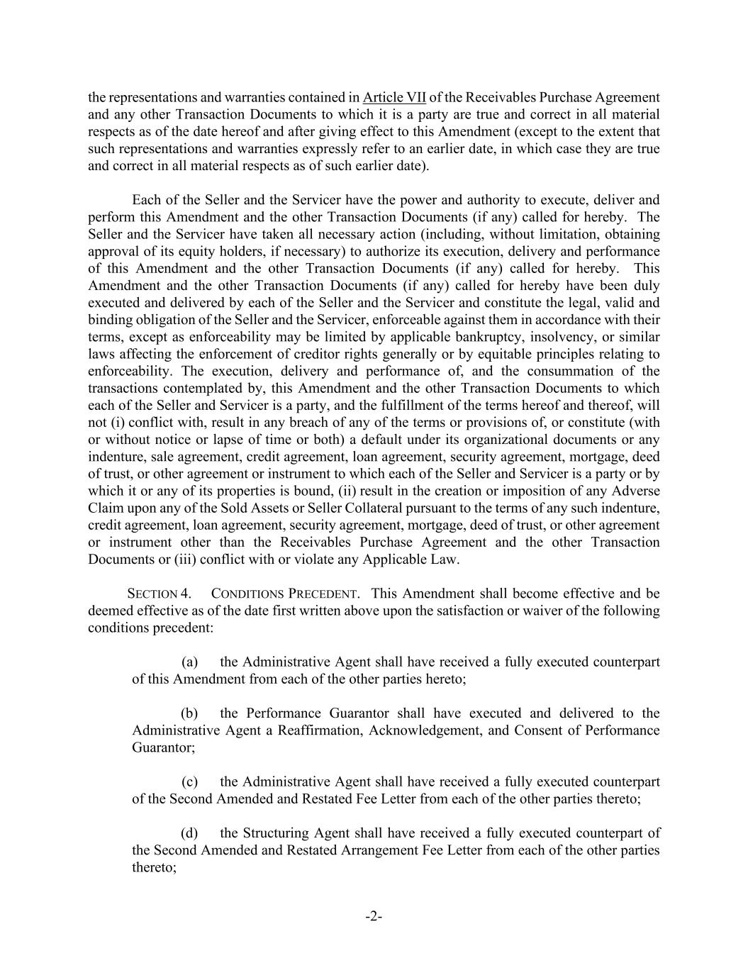 -2- the representations and warranties contained in Article VII of the Receivables Purchase Agreement and any other Transaction Documents to which it is a party are true and correct in all material respects as of the date hereof and after giving effect to this Amendment (except to the extent that such representations and warranties expressly refer to an earlier date, in which case they are true and correct in all material respects as of such earlier date). Each of the Seller and the Servicer have the power and authority to execute, deliver and perform this Amendment and the other Transaction Documents (if any) called for hereby. The Seller and the Servicer have taken all necessary action (including, without limitation, obtaining approval of its equity holders, if necessary) to authorize its execution, delivery and performance of this Amendment and the other Transaction Documents (if any) called for hereby. This Amendment and the other Transaction Documents (if any) called for hereby have been duly executed and delivered by each of the Seller and the Servicer and constitute the legal, valid and binding obligation of the Seller and the Servicer, enforceable against them in accordance with their terms, except as enforceability may be limited by applicable bankruptcy, insolvency, or similar laws affecting the enforcement of creditor rights generally or by equitable principles relating to enforceability. The execution, delivery and performance of, and the consummation of the transactions contemplated by, this Amendment and the other Transaction Documents to which each of the Seller and Servicer is a party, and the fulfillment of the terms hereof and thereof, will not (i) conflict with, result in any breach of any of the terms or provisions of, or constitute (with or without notice or lapse of time or both) a default under its organizational documents or any indenture, sale agreement, credit agreement, loan agreement, security agreement, mortgage, deed of trust, or other agreement or instrument to which each of the Seller and Servicer is a party or by which it or any of its properties is bound, (ii) result in the creation or imposition of any Adverse Claim upon any of the Sold Assets or Seller Collateral pursuant to the terms of any such indenture, credit agreement, loan agreement, security agreement, mortgage, deed of trust, or other agreement or instrument other than the Receivables Purchase Agreement and the other Transaction Documents or (iii) conflict with or violate any Applicable Law. SECTION 4. CONDITIONS PRECEDENT. This Amendment shall become effective and be deemed effective as of the date first written above upon the satisfaction or waiver of the following conditions precedent: (a) the Administrative Agent shall have received a fully executed counterpart of this Amendment from each of the other parties hereto; (b) the Performance Guarantor shall have executed and delivered to the Administrative Agent a Reaffirmation, Acknowledgement, and Consent of Performance Guarantor; (c) the Administrative Agent shall have received a fully executed counterpart of the Second Amended and Restated Fee Letter from each of the other parties thereto; (d) the Structuring Agent shall have received a fully executed counterpart of the Second Amended and Restated Arrangement Fee Letter from each of the other parties thereto;