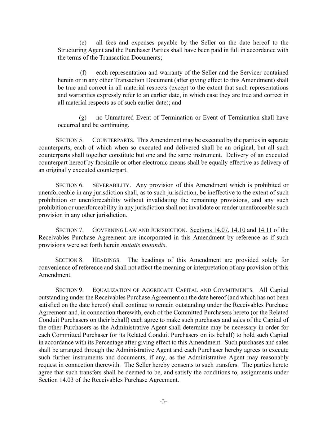 -3- (e) all fees and expenses payable by the Seller on the date hereof to the Structuring Agent and the Purchaser Parties shall have been paid in full in accordance with the terms of the Transaction Documents; (f) each representation and warranty of the Seller and the Servicer contained herein or in any other Transaction Document (after giving effect to this Amendment) shall be true and correct in all material respects (except to the extent that such representations and warranties expressly refer to an earlier date, in which case they are true and correct in all material respects as of such earlier date); and (g) no Unmatured Event of Termination or Event of Termination shall have occurred and be continuing. SECTION 5. COUNTERPARTS. This Amendment may be executed by the parties in separate counterparts, each of which when so executed and delivered shall be an original, but all such counterparts shall together constitute but one and the same instrument. Delivery of an executed counterpart hereof by facsimile or other electronic means shall be equally effective as delivery of an originally executed counterpart. SECTION 6. SEVERABILITY. Any provision of this Amendment which is prohibited or unenforceable in any jurisdiction shall, as to such jurisdiction, be ineffective to the extent of such prohibition or unenforceability without invalidating the remaining provisions, and any such prohibition or unenforceability in any jurisdiction shall not invalidate or render unenforceable such provision in any other jurisdiction. SECTION 7. GOVERNING LAW AND JURISDICTION. Sections 14.07, 14.10 and 14.11 of the Receivables Purchase Agreement are incorporated in this Amendment by reference as if such provisions were set forth herein mutatis mutandis. SECTION 8. HEADINGS. The headings of this Amendment are provided solely for convenience of reference and shall not affect the meaning or interpretation of any provision of this Amendment. SECTION 9. EQUALIZATION OF AGGREGATE CAPITAL AND COMMITMENTS. All Capital outstanding under the Receivables Purchase Agreement on the date hereof (and which has not been satisfied on the date hereof) shall continue to remain outstanding under the Receivables Purchase Agreement and, in connection therewith, each of the Committed Purchasers hereto (or the Related Conduit Purchasers on their behalf) each agree to make such purchases and sales of the Capital of the other Purchasers as the Administrative Agent shall determine may be necessary in order for each Committed Purchaser (or its Related Conduit Purchasers on its behalf) to hold such Capital in accordance with its Percentage after giving effect to this Amendment. Such purchases and sales shall be arranged through the Administrative Agent and each Purchaser hereby agrees to execute such further instruments and documents, if any, as the Administrative Agent may reasonably request in connection therewith. The Seller hereby consents to such transfers. The parties hereto agree that such transfers shall be deemed to be, and satisfy the conditions to, assignments under Section 14.03 of the Receivables Purchase Agreement.