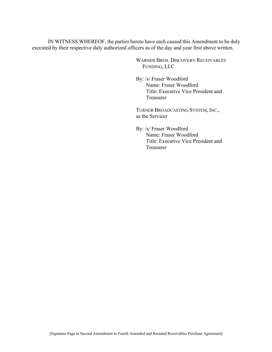 [Signature Page to Second Amendment to Fourth Amended and Restated Receivables Purchase Agreement] IN WITNESS WHEREOF, the parties hereto have each caused this Amendment to be duly executed by their respective duly authorized officers as of the day and year first above written. WARNER BROS. DISCOVERY RECEIVABLES FUNDING, LLC By: /s/ Fraser Woodford Name: Fraser Woodford Title: Executive Vice President and Treasurer TURNER BROADCASTING SYSTEM, INC., as the Servicer By: /s/ Fraser Woodford Name: Fraser Woodford Title: Executive Vice President and Treasurer