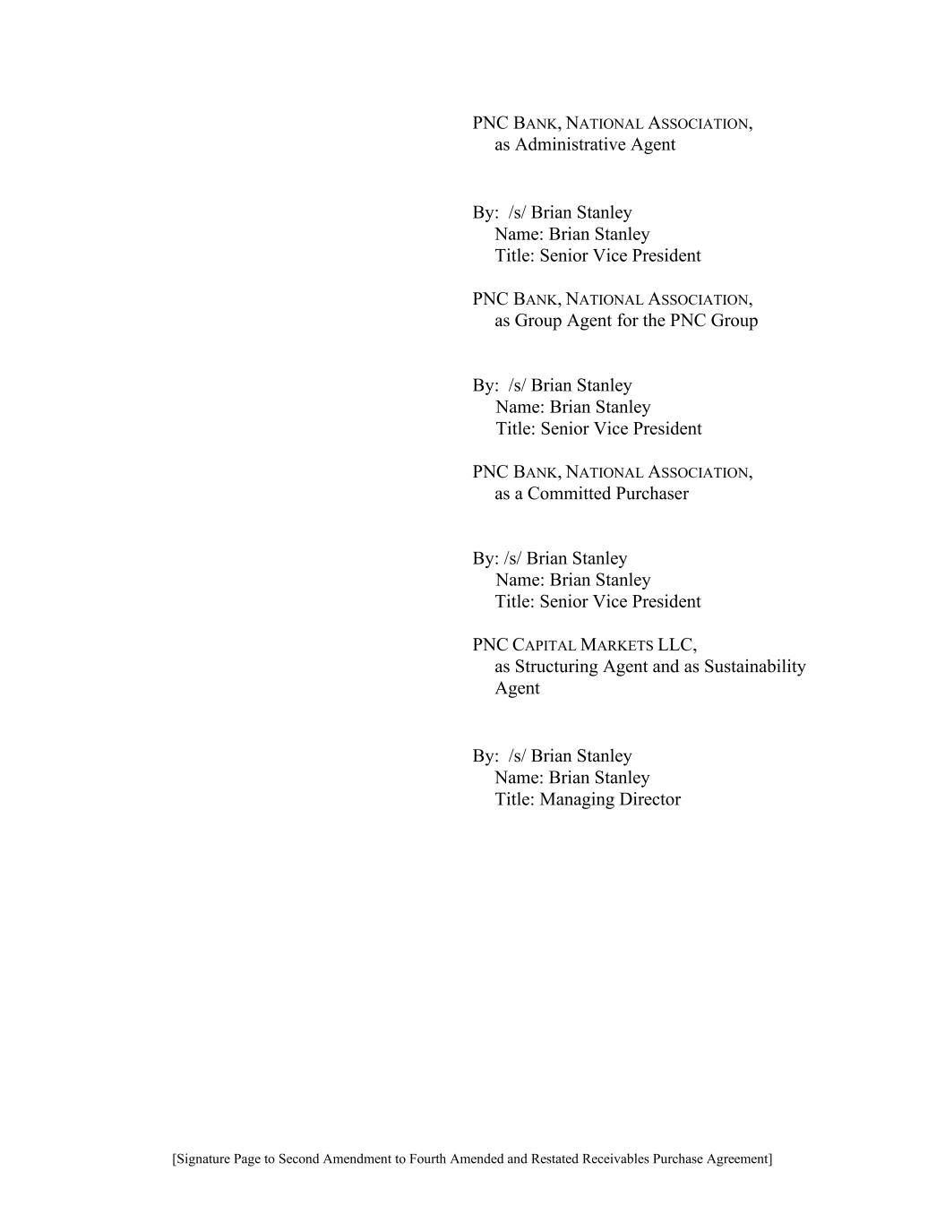 [Signature Page to Second Amendment to Fourth Amended and Restated Receivables Purchase Agreement] PNC BANK, NATIONAL ASSOCIATION, as Administrative Agent By: /s/ Brian Stanley Name: Brian Stanley Title: Senior Vice President PNC BANK, NATIONAL ASSOCIATION, as Group Agent for the PNC Group By: /s/ Brian Stanley Name: Brian Stanley Title: Senior Vice President PNC BANK, NATIONAL ASSOCIATION, as a Committed Purchaser By: /s/ Brian Stanley Name: Brian Stanley Title: Senior Vice President PNC CAPITAL MARKETS LLC, as Structuring Agent and as Sustainability Agent By: /s/ Brian Stanley Name: Brian Stanley Title: Managing Director