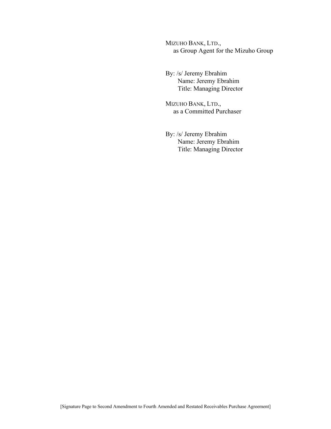 [Signature Page to Second Amendment to Fourth Amended and Restated Receivables Purchase Agreement] MIZUHO BANK, LTD., as Group Agent for the Mizuho Group By: /s/ Jeremy Ebrahim Name: Jeremy Ebrahim Title: Managing Director MIZUHO BANK, LTD., as a Committed Purchaser By: /s/ Jeremy Ebrahim Name: Jeremy Ebrahim Title: Managing Director