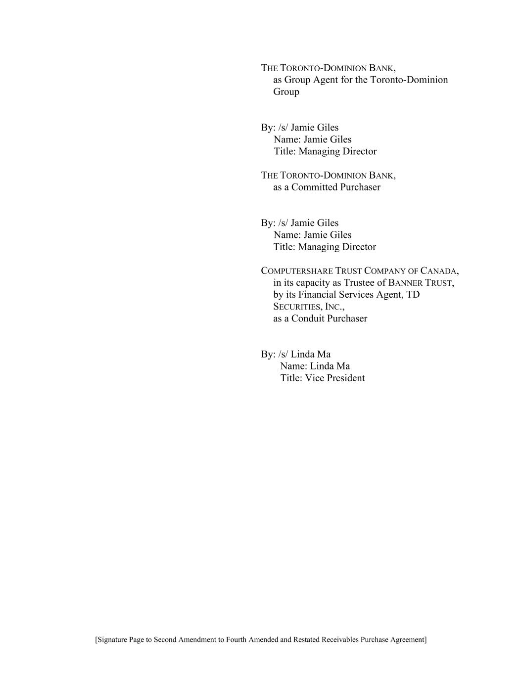 [Signature Page to Second Amendment to Fourth Amended and Restated Receivables Purchase Agreement] THE TORONTO-DOMINION BANK, as Group Agent for the Toronto-Dominion Group By: /s/ Jamie Giles Name: Jamie Giles Title: Managing Director THE TORONTO-DOMINION BANK, as a Committed Purchaser By: /s/ Jamie Giles Name: Jamie Giles Title: Managing Director COMPUTERSHARE TRUST COMPANY OF CANADA, in its capacity as Trustee of BANNER TRUST, by its Financial Services Agent, TD SECURITIES, INC., as a Conduit Purchaser By: /s/ Linda Ma Name: Linda Ma Title: Vice President
