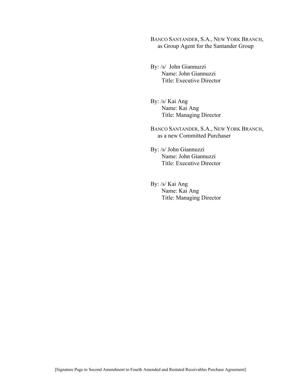 [Signature Page to Second Amendment to Fourth Amended and Restated Receivables Purchase Agreement] BANCO SANTANDER, S.A., NEW YORK BRANCH, as Group Agent for the Santander Group By: /s/ John Giannuzzi Name: John Giannuzzi Title: Executive Director By: /s/ Kai Ang Name: Kai Ang Title: Managing Director BANCO SANTANDER, S.A., NEW YORK BRANCH, as a new Committed Purchaser By: /s/ John Giannuzzi Name: John Giannuzzi Title: Executive Director By: /s/ Kai Ang Name: Kai Ang Title: Managing Director