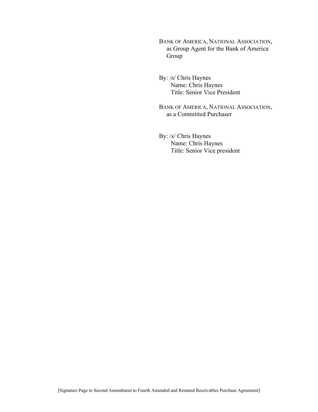 [Signature Page to Second Amendment to Fourth Amended and Restated Receivables Purchase Agreement] BANK OF AMERICA, NATIONAL ASSOCIATION, as Group Agent for the Bank of America Group By: /s/ Chris Haynes Name: Chris Haynes Title: Senior Vice President BANK OF AMERICA, NATIONAL ASSOCIATION, as a Committed Purchaser By: /s/ Chris Haynes Name: Chris Haynes Title: Senior Vice president