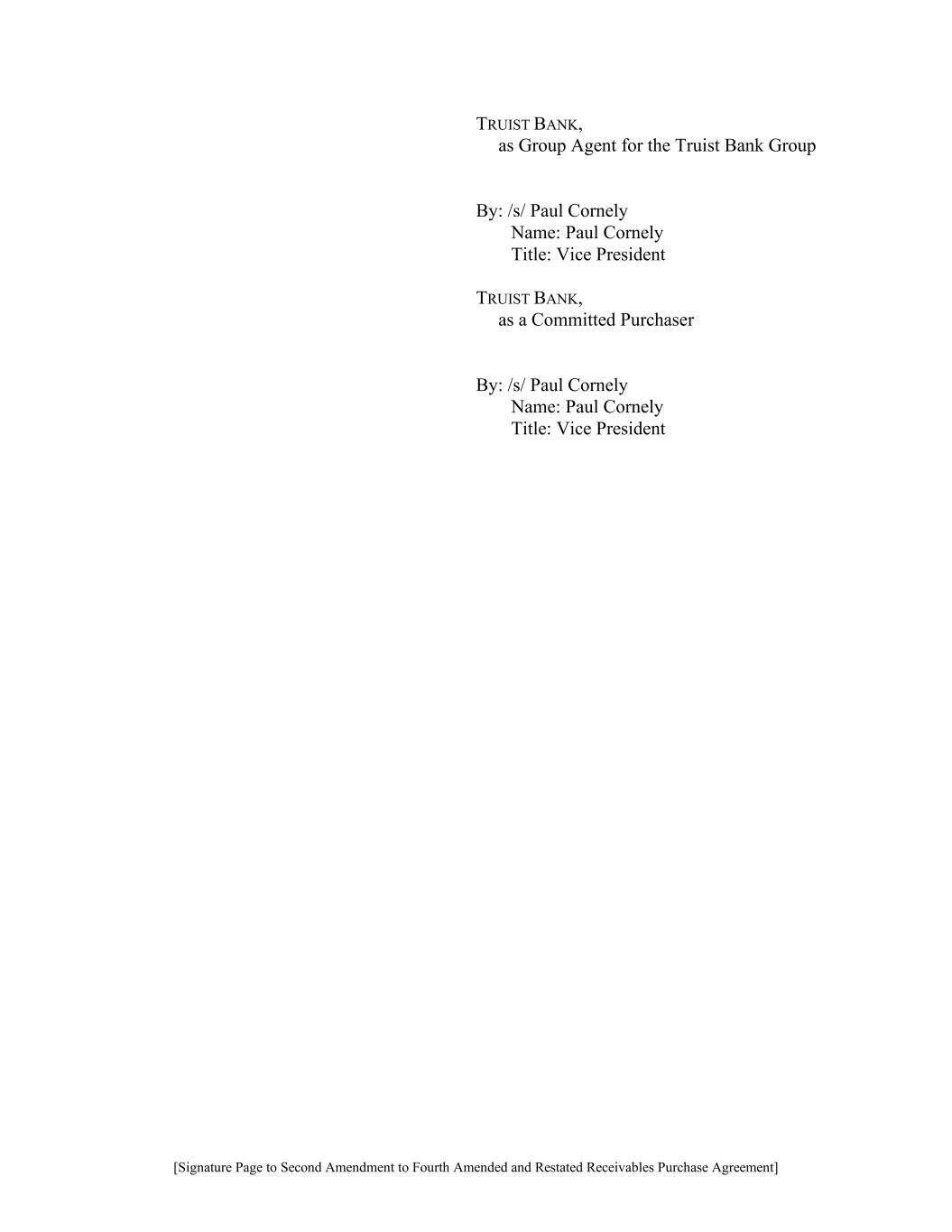 [Signature Page to Second Amendment to Fourth Amended and Restated Receivables Purchase Agreement] TRUIST BANK, as Group Agent for the Truist Bank Group By: /s/ Paul Cornely Name: Paul Cornely Title: Vice President TRUIST BANK, as a Committed Purchaser By: /s/ Paul Cornely Name: Paul Cornely Title: Vice President