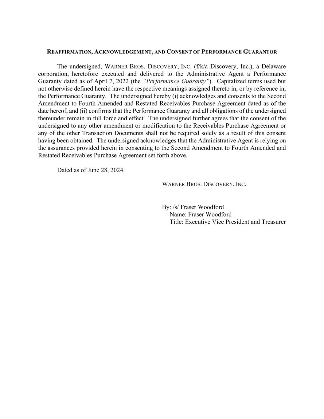 REAFFIRMATION, ACKNOWLEDGEMENT, AND CONSENT OF PERFORMANCE GUARANTOR The undersigned, WARNER BROS. DISCOVERY, INC. (f/k/a Discovery, Inc.), a Delaware corporation, heretofore executed and delivered to the Administrative Agent a Performance Guaranty dated as of April 7, 2022 (the “Performance Guaranty”). Capitalized terms used but not otherwise defined herein have the respective meanings assigned thereto in, or by reference in, the Performance Guaranty. The undersigned hereby (i) acknowledges and consents to the Second Amendment to Fourth Amended and Restated Receivables Purchase Agreement dated as of the date hereof, and (ii) confirms that the Performance Guaranty and all obligations of the undersigned thereunder remain in full force and effect. The undersigned further agrees that the consent of the undersigned to any other amendment or modification to the Receivables Purchase Agreement or any of the other Transaction Documents shall not be required solely as a result of this consent having been obtained. The undersigned acknowledges that the Administrative Agent is relying on the assurances provided herein in consenting to the Second Amendment to Fourth Amended and Restated Receivables Purchase Agreement set forth above. Dated as of June 28, 2024. WARNER BROS. DISCOVERY, INC. By: /s/ Fraser Woodford Name: Fraser Woodford Title: Executive Vice President and Treasurer